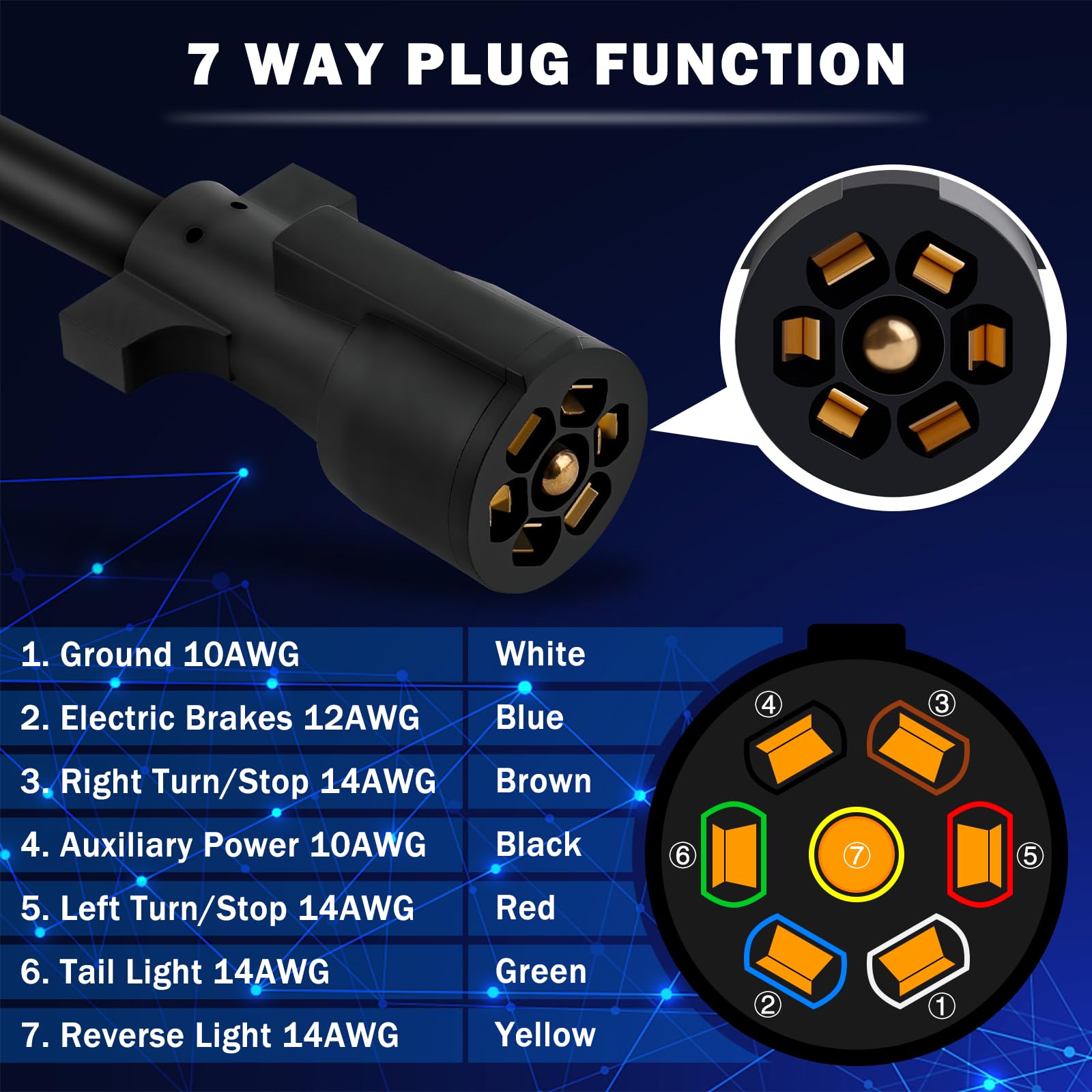 - PURE COPPER POWER CORD: The 7 way trailer wire is made of high-quality pure copper and has a long service life. And has excellent electrical and thermal conductivity, to ensure the normal use of car lights in the process of driving (such as turn signal and brake lights, etc.)