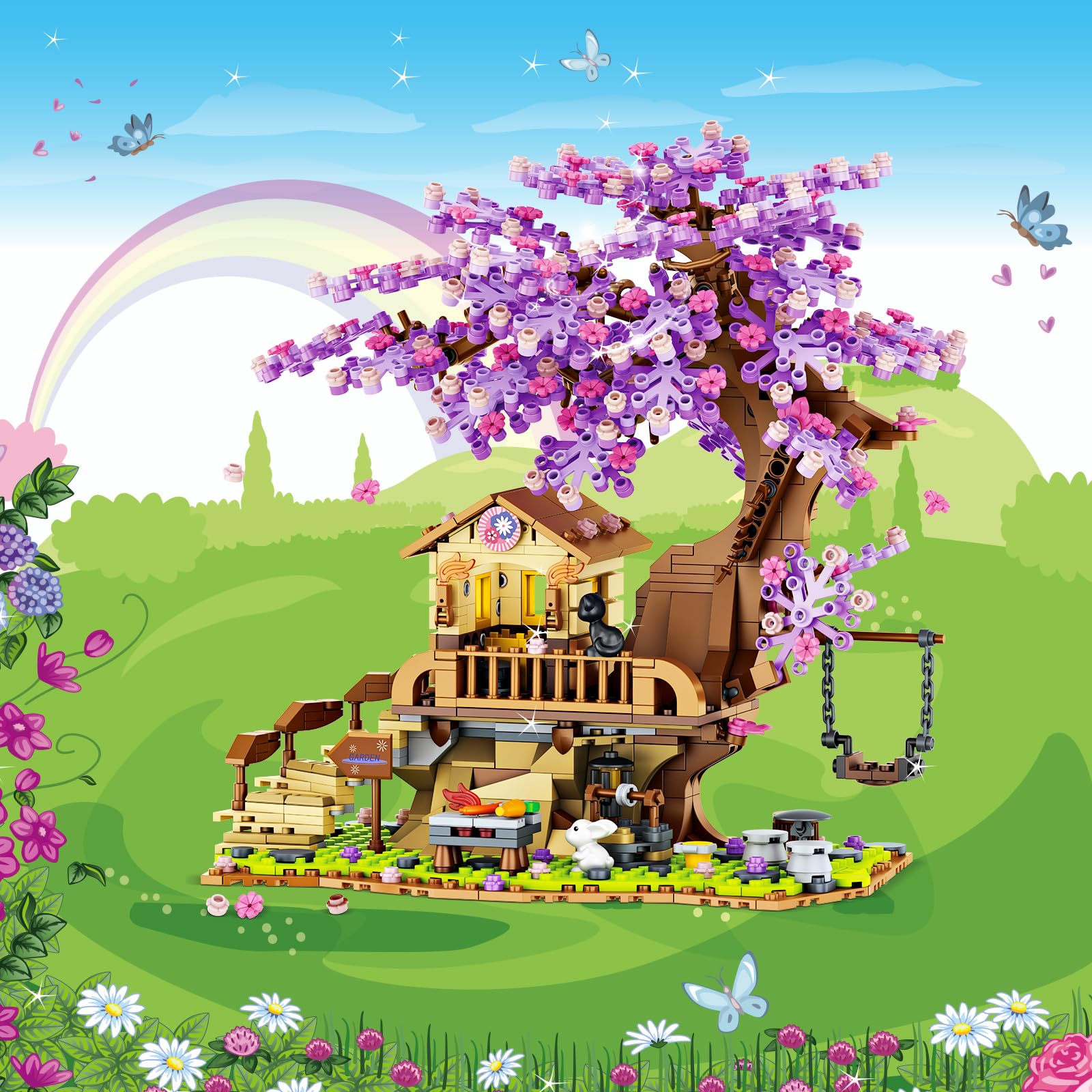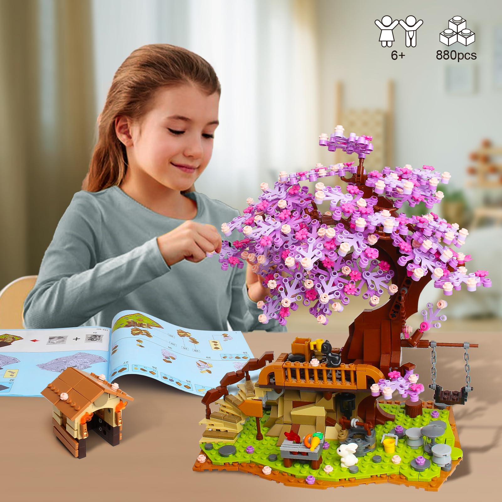 - Cherry Blossom Tree House Building Toy- The 880pcs tree house building kit is colorful and beautifully designed. The fantastic cherry blossom tree hides a lovely tree house, beautiful garden and shows a wonderful idyllic life. Building this toy is a unique experience for children who have been living in the reinforced concrete city for a long time. Any child who loves nature will want to own this cherry blossom tree house