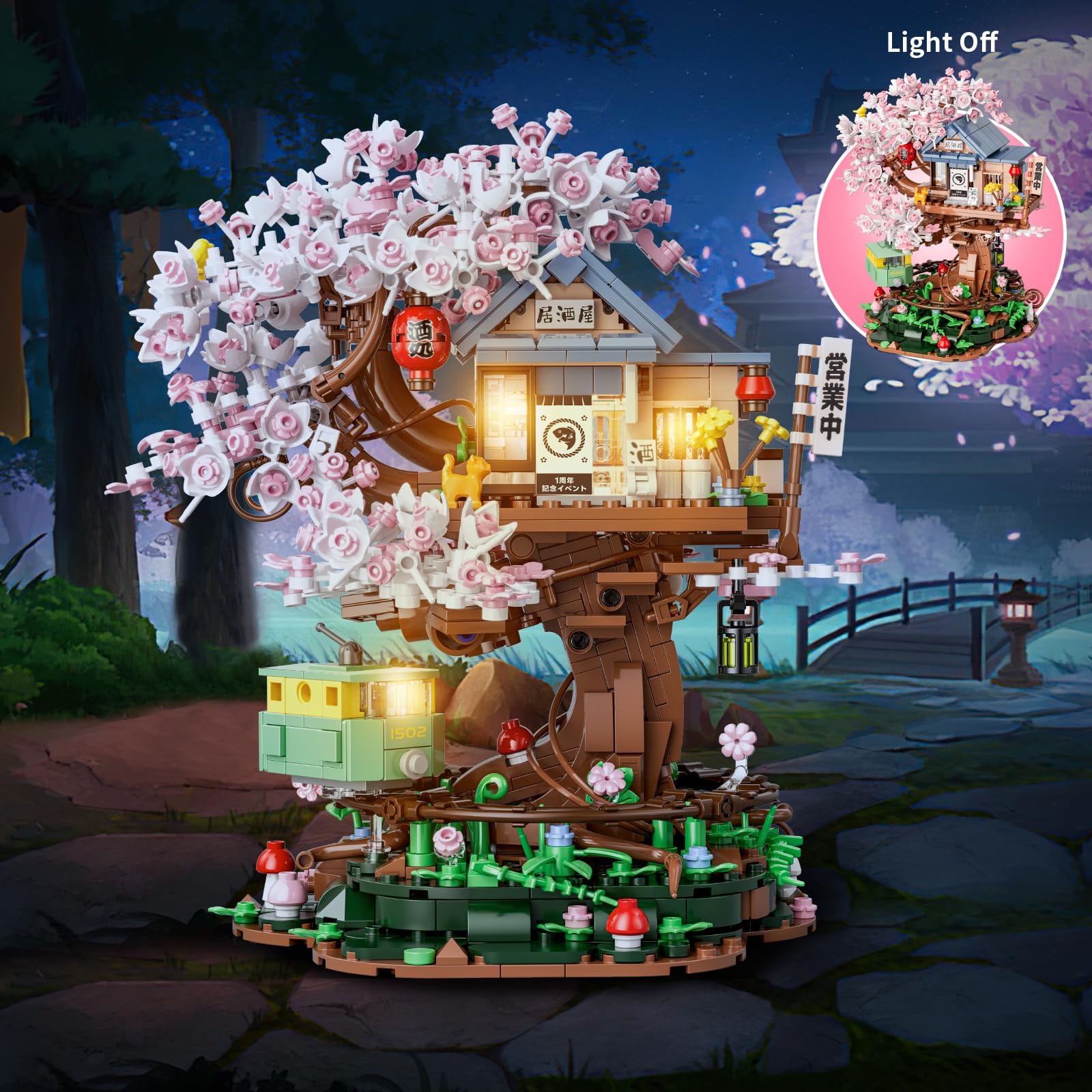 - 【Cherry Blossom Flowers Tree House Kit】This treehouse architecture building toy is inspired by real japanese izakaya shop, features a izakaya shop and cherry blossom sakura tree, perfect for kids boys girls aged 8 9 10 and above to create. The irregular base adds authenticity, mimicking the ground beneath a real treehouse. Also,you will discover a variety of details, cute grazing rabbits, plants and trees, cable car, sakura flower tree and a japan izakaya store and more.