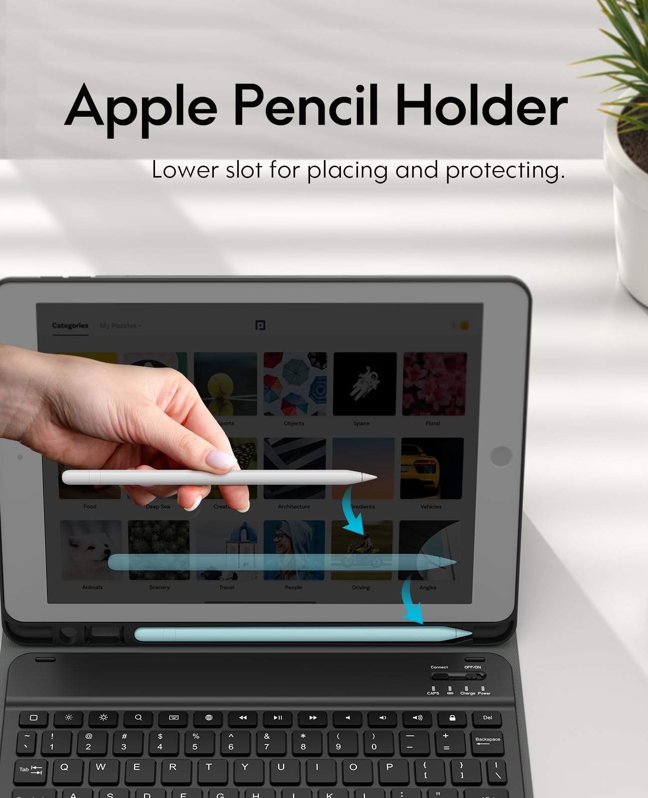 - Built-in Pencil Holder: Built-in Apple Pencil holder, cap & adapter slots, grab your Apple Pencil, easily to carry and use. Notice: The keyboard will enter into sleep mode if it doesn't work for 10 minutes, and it will disconnect with your tablet. It will wake up and connect to your tablet again when pressing any key.