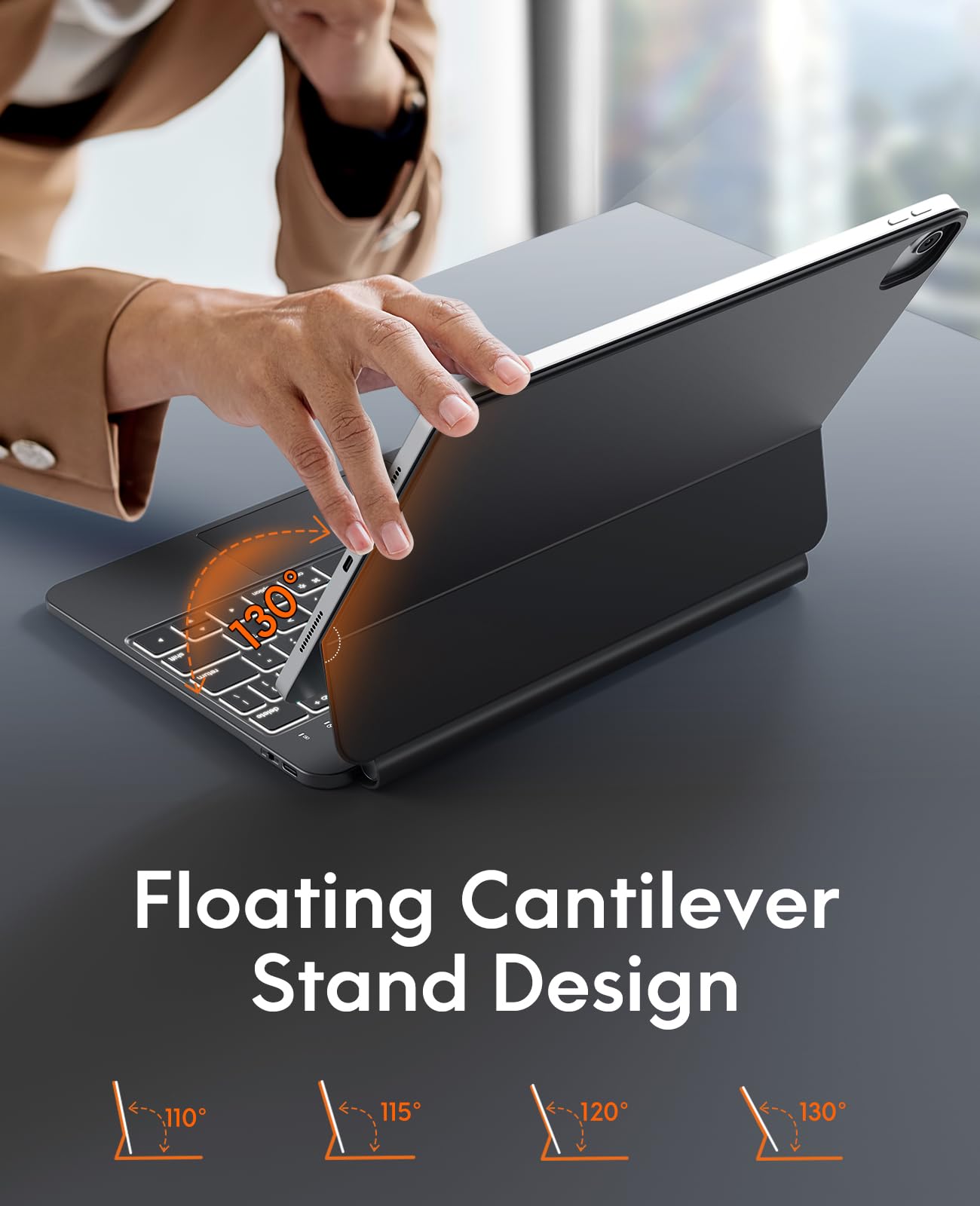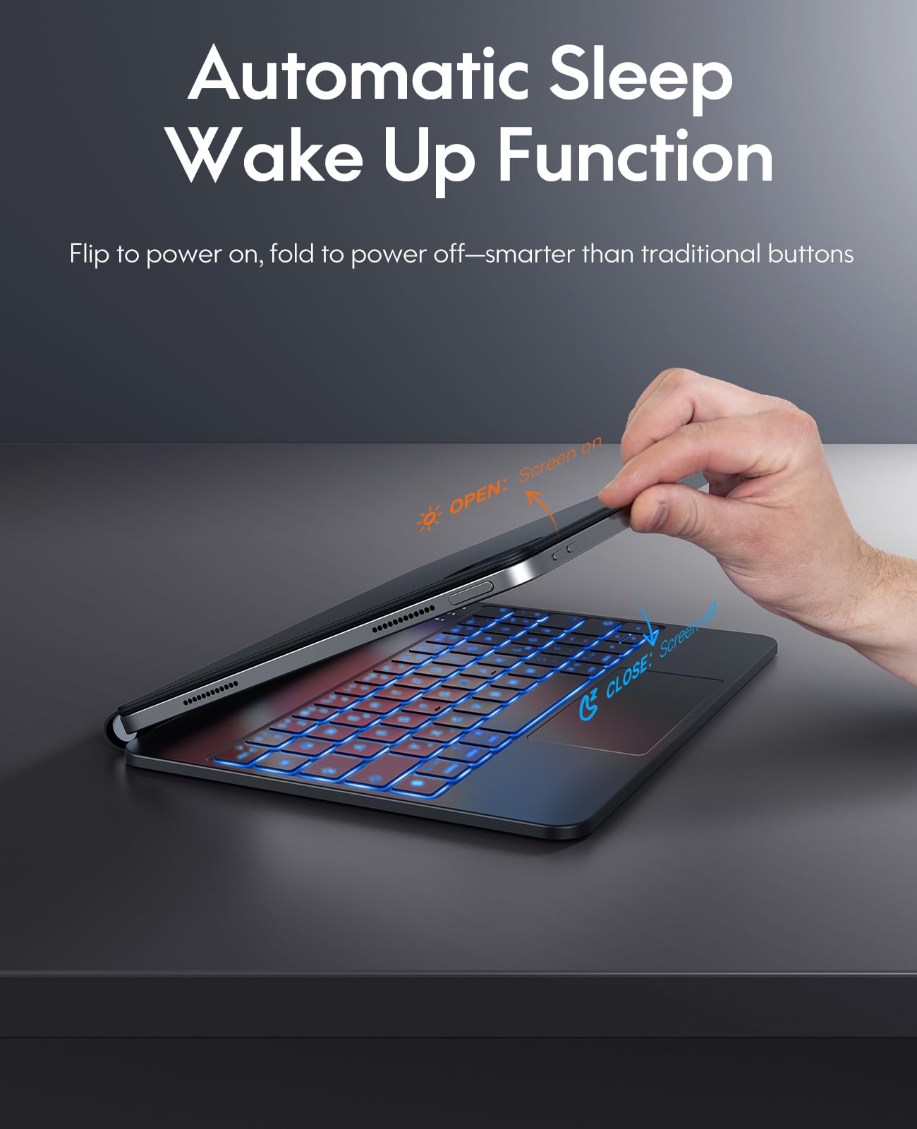 - 7-Color Backlight: This magic keyboard for tablet comes with 7 adjustable backlight colors and 3 levels of brightness adjustment (low/medium/high) for effortless typing in any lighting condition. Intelligent power-saving design, the backlight automatically turns off after 30 seconds of no operation.