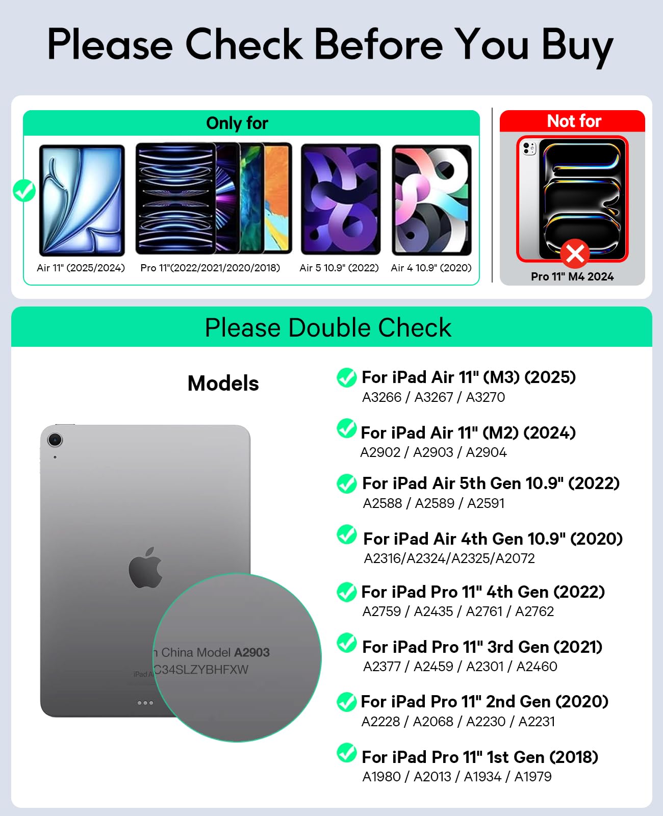 - Compatibility: This keyboard case is designed for iPad Air 11-inch M3 2025 (A3266/A3267/A3270) & for iPad Air 11-inch M2 2024 (A2902/A2903/A2904) & for iPad Pro 11-inch 4th Gen 2022 (A2759/A2759/A2761/A2762) & for iPad Pro 11-inch 3rd Gen 2021 (A2377/A2301/A2459/A2460) & for iPad Pro 11-inch 2nd Gen 2020 (A2228/A2068/A2230/A2231) & for tablet Pro 11-inch 1st Gen 2018 (A1980/A2013/A1934) & for tablet Air 5th Gen 10.9-inch 2022 (A2588/A2589/A2591) & for iPad Air 4th Gen 10.9-inch 2020 (A2072/A2316/A2324/A2325).