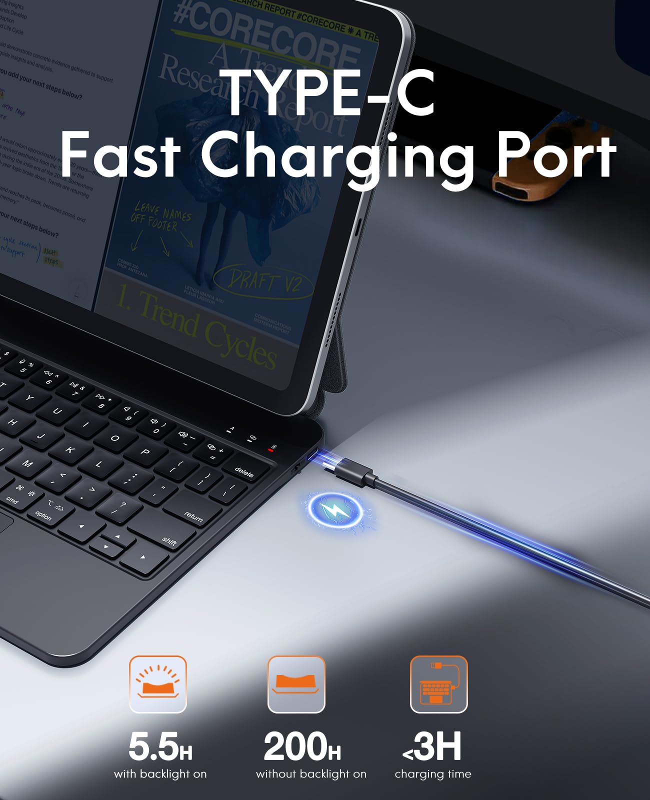 - Type-C Rechargeable: The keyboard case for tablet can be fully charged within a few hours with the Type-C charging cable included in the package. With ultra-long battery life, you can enjoy uninterrupted use under no backlit condition.