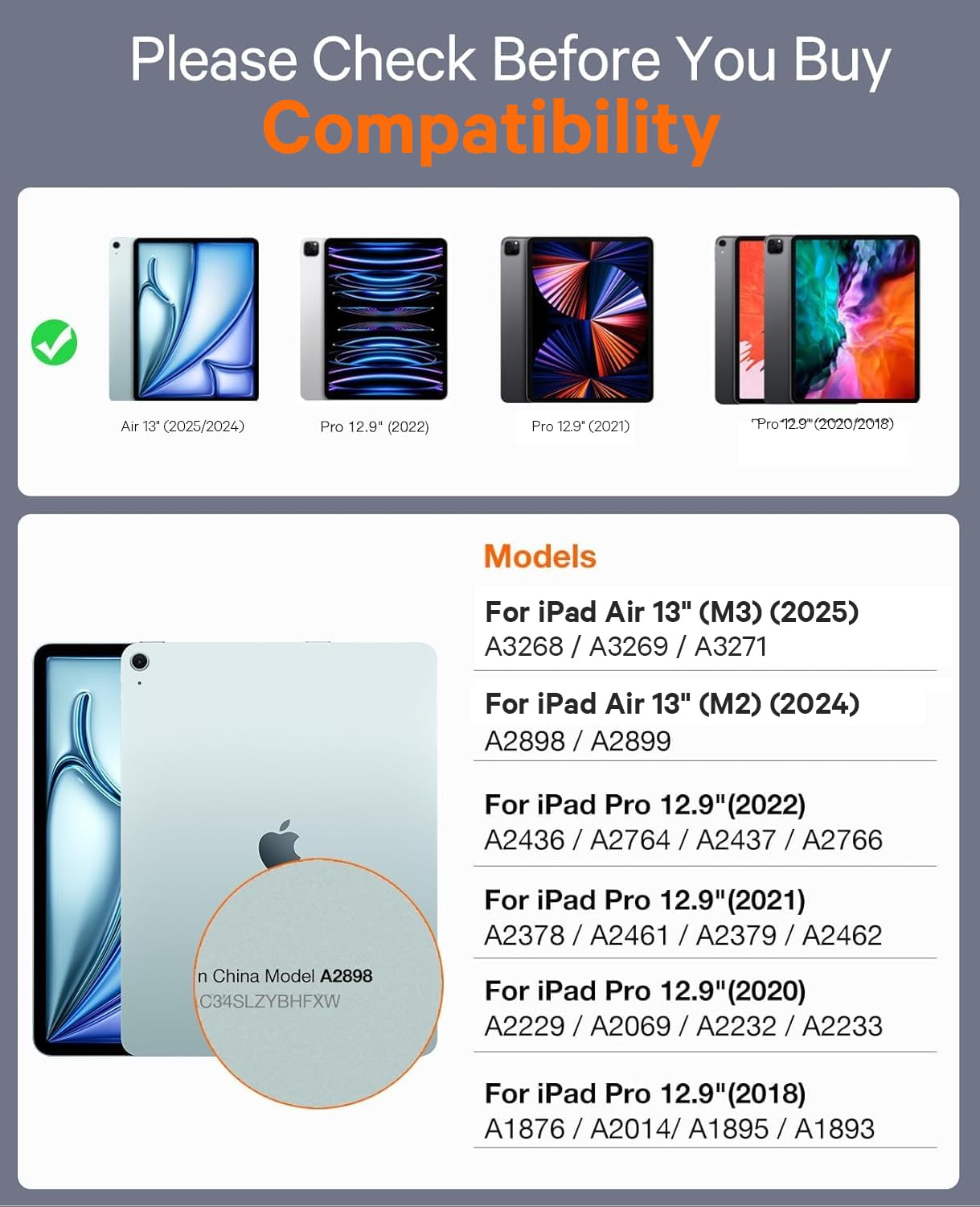 - Compatibility: This keyboard case is designed for iPad Air 13-inch M3 2025 (A3268/A3269/A3271) & for iPad Air 13-inch M2 2024 (A2898/A2899/A2900) & for iPad Pro 12.9 inch 3rd generation 2018 (A1876/A2014/A1895/A1983) & for iPad Pro 12.9 inch 4th generation 2020 (A2229/A2069/A2232/A2233) & for iPad Pro 12.9 inch 5th generation 2021 (A2378/A2379/A2461/A2462) & for iPad Pro 12.9 inch 6th generation 2022 (A2436/A2437/2764/A2766). NOTE: NOT FIT FOR IPAD PRO 13 INCH (M4) 2024.
