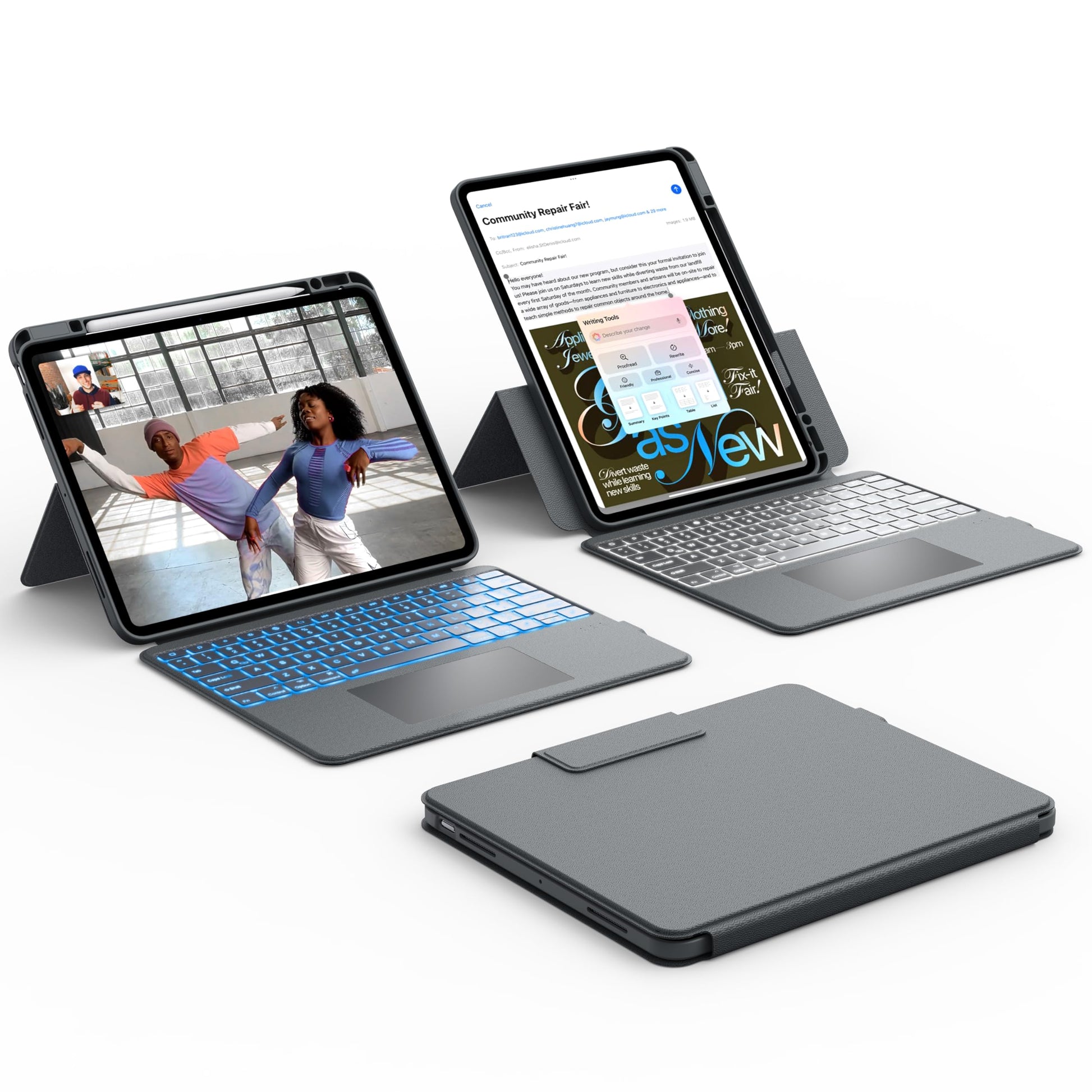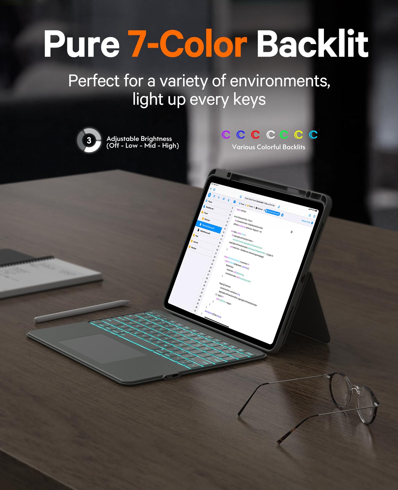 - 7-Colors Backlit & Shortcuts: With 7 backlight colors and 3 levels of brightness, it's easy to use your tablet even in dark environments. Adjust the brightness to match your preferences, providing an excellent typing experience even in low light or at night. With a complete set of multimedia shortcuts, you can effortlessly control volume, and manage music playback, elevating the multimedia capabilities of your case with keyboard.