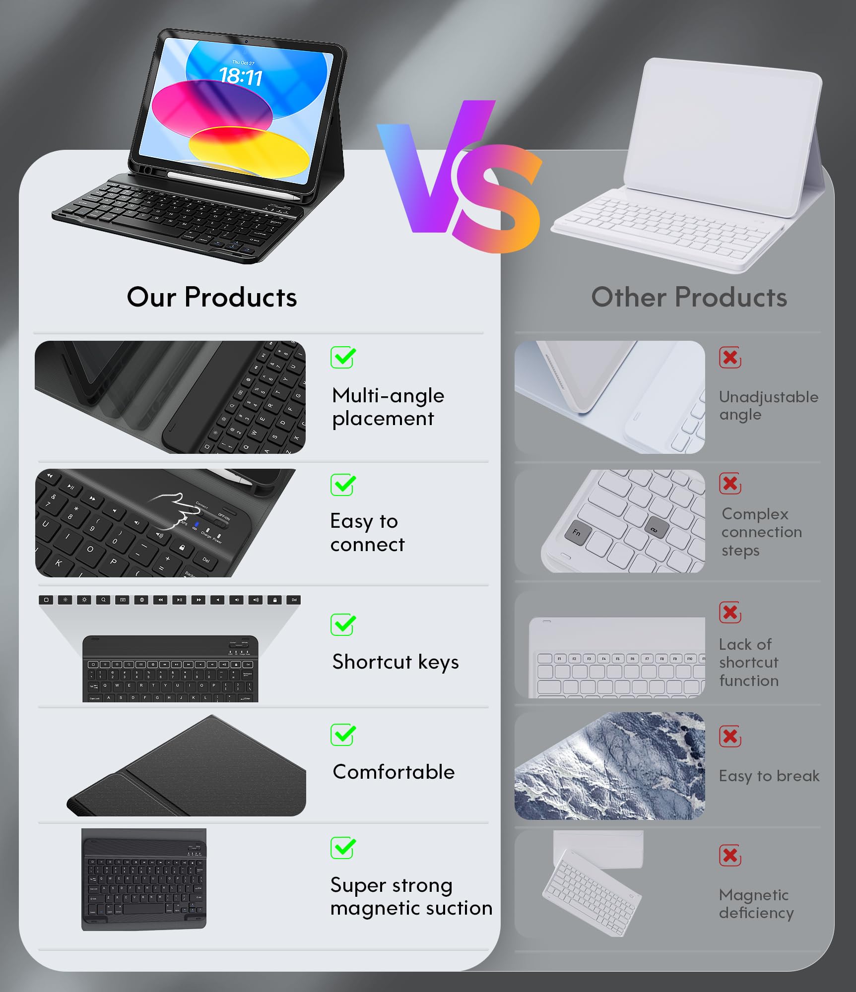 - Compatibility: This tablet wireless keyboard is compatible with iPad (A16) 11th 2025 (A3354/A3355/A3356) & for iPad 10th Gen 10.9 inch 2022 (A2696/A2757/A2777). Please check your tablet model carefully before purchasing.