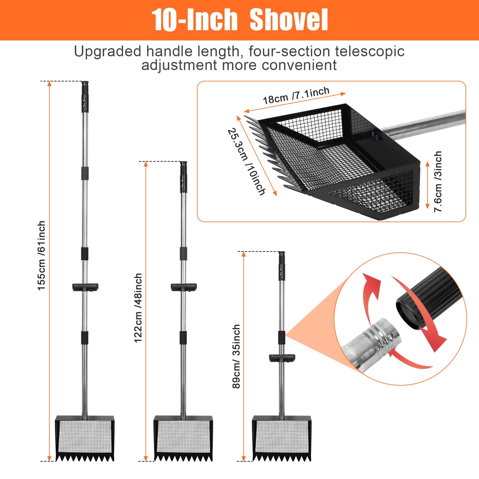 - Multi-function Sifting Shovel - Different lengths for different tasks. This sifting shovel for sand can be adjusted to the right length to be used as a cat litter scooper, beach search sand scoop and cow pens shovel, etc. Perfect for cleaning chicken litter, horse apples, dog piles, and cleaning out the sandbox. After use, the chicken coop accessories is very easy to clean with just water flushing