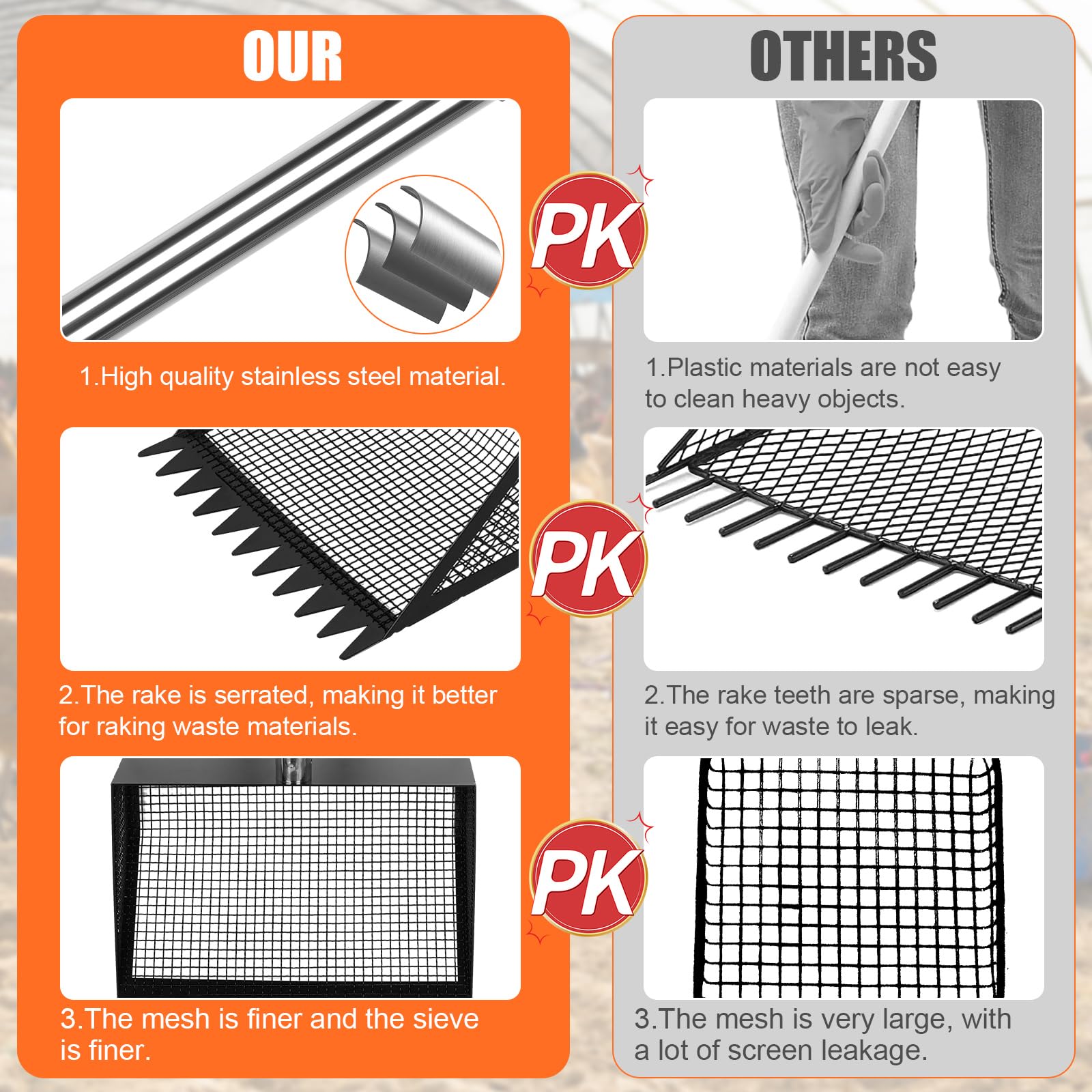- 2 in1 Chicken Poop Scooper and Rake: First, you can use this chicken poop scooper to cleaning coops through sifting the poops from sand or wood chips in chicken coop. Then, this poop scooper can be used as a rake to clean chicken feathers, leaves or dead grass for a much cleaner coop environment for your animals. Save your money and energy