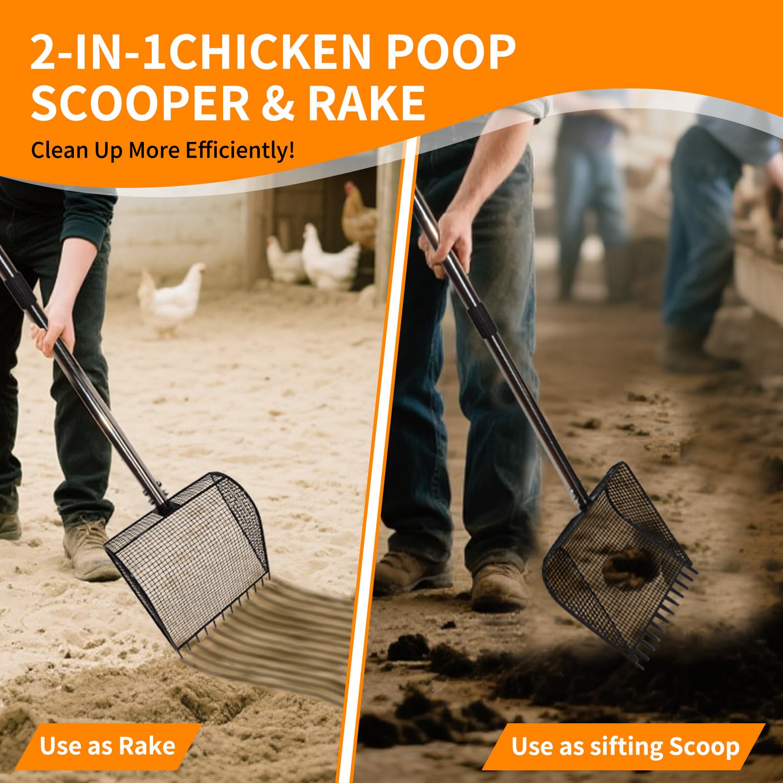 - ✅ 2-in-1 Rake & Sifting Functionality Eliminate tool-switching with this dual-purpose design! Efficiently clean chicken coops by scooping manure, sift bedding sand, and rake debris – all with a single heavy-duty tool. Perfect for poultry keepers and garden maintenance.