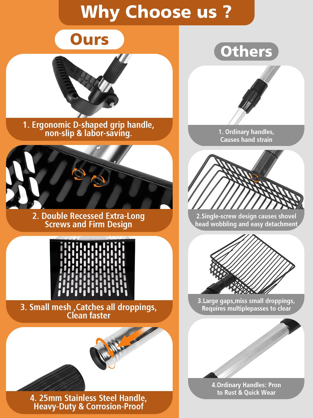 - 【Versatile for Multiple Uses】An essential pooper scooper tool that handles different cleaning tasks with ease. Also works great on Cat litter boxes Horse stalls & dog kennels Garden debris & sandpits .The go-to tool for gardeners, pet owners, and a practical gift choice.