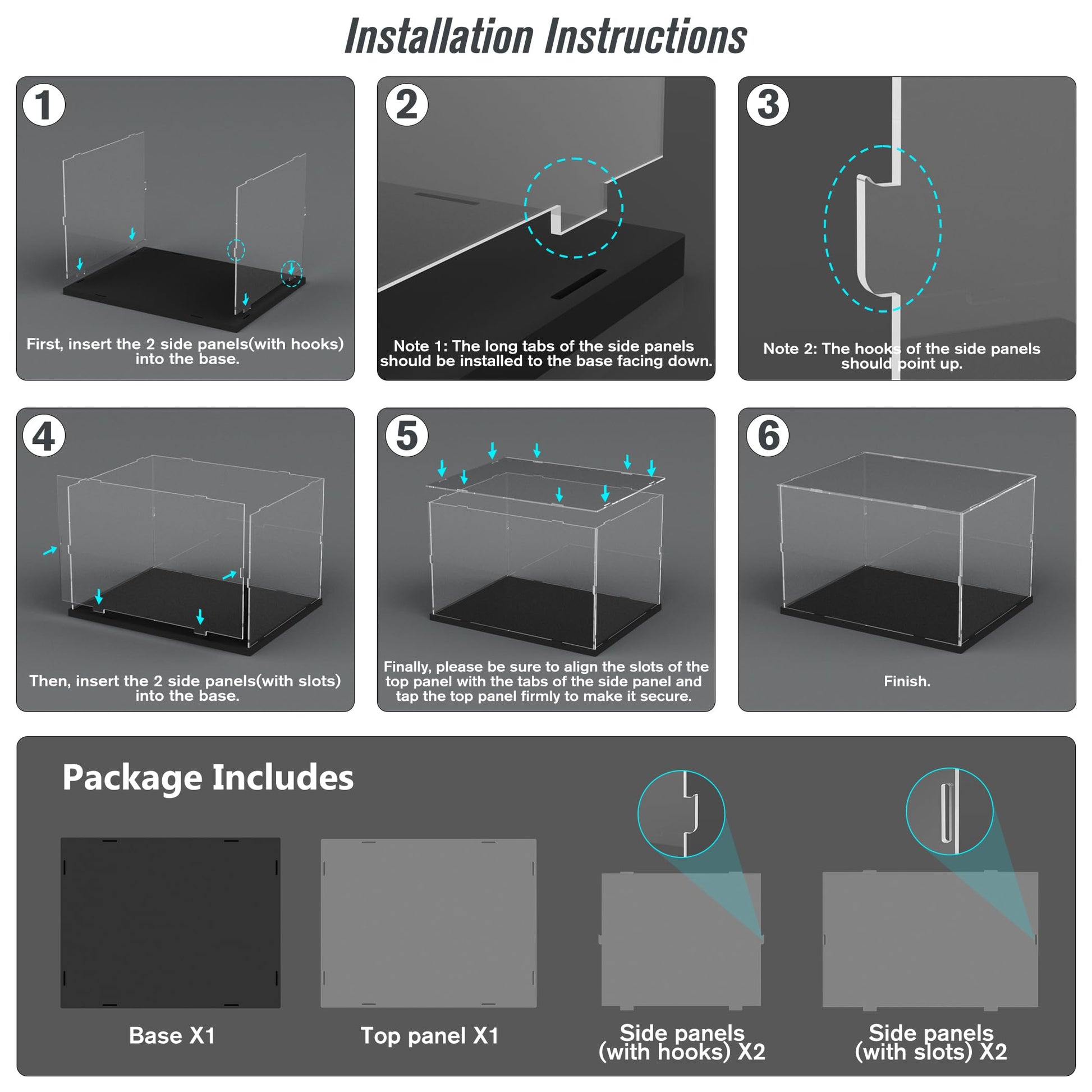 - 【Easy To Assemble】With glue-free design, the panel cutting is accurate. You only need to tear off the protective film on both sides of the acrylic sheet, and connect the acrylic sheet with the wood plastic board according to our installation instructions. (NOTE: In order to make the display case can be a firm unit, the slots of the lid and the tabs of the side panels are designed to be very tightly. Please be sure to align the slots first and then tap the lid firmly to make it secure.)