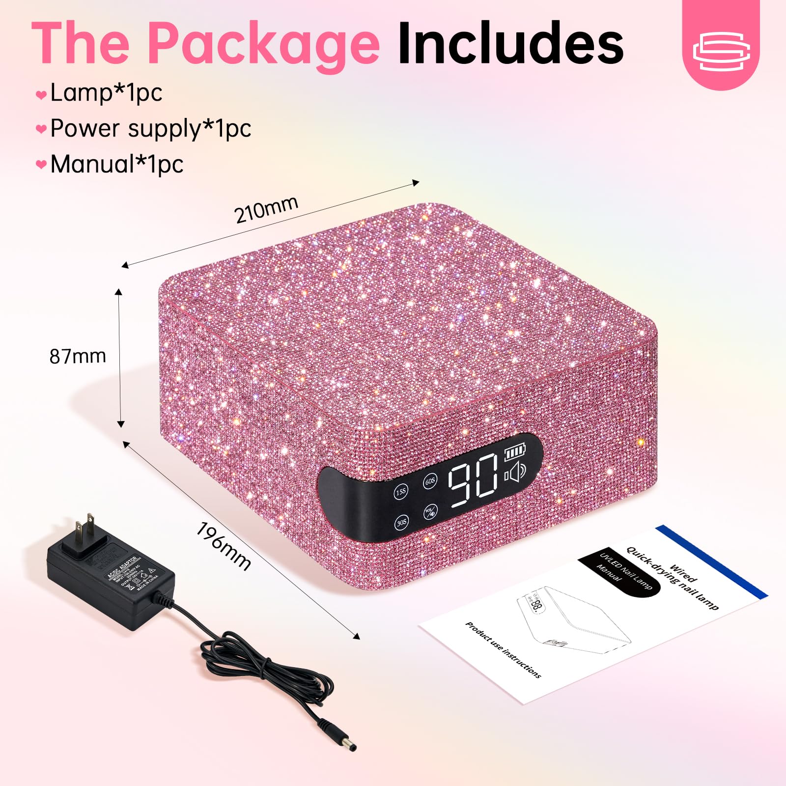 - Sparkling & Spacious: Every inch of our nail lamp is adorned with hand-applied diamonds, resulting in a stunningly shiny surface. Its spacious design accommodates the curing of up to five fingernails or toenails at once, making it suitable for any occasion, whether you're running a professional salon or engaging in a DIY nail session at home.