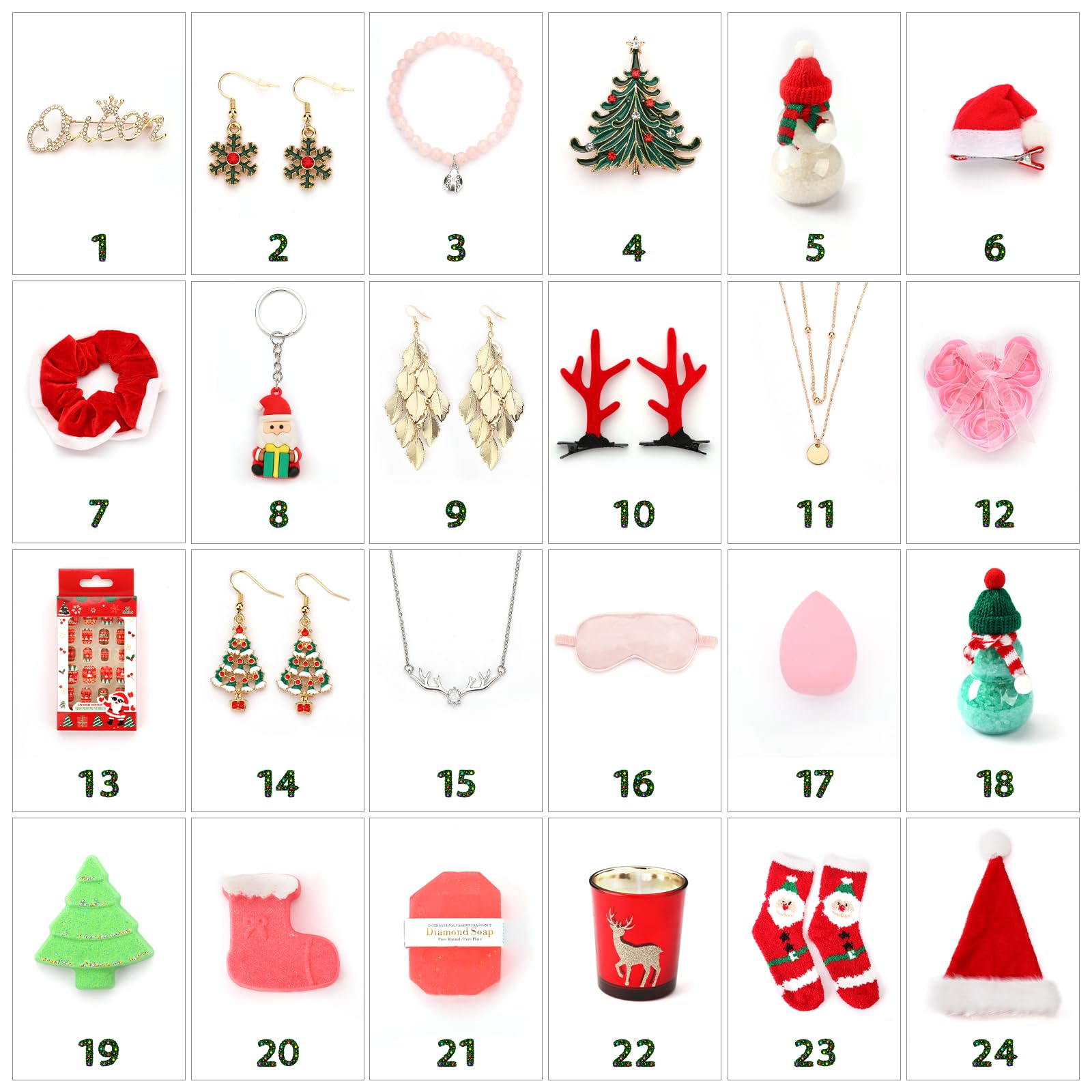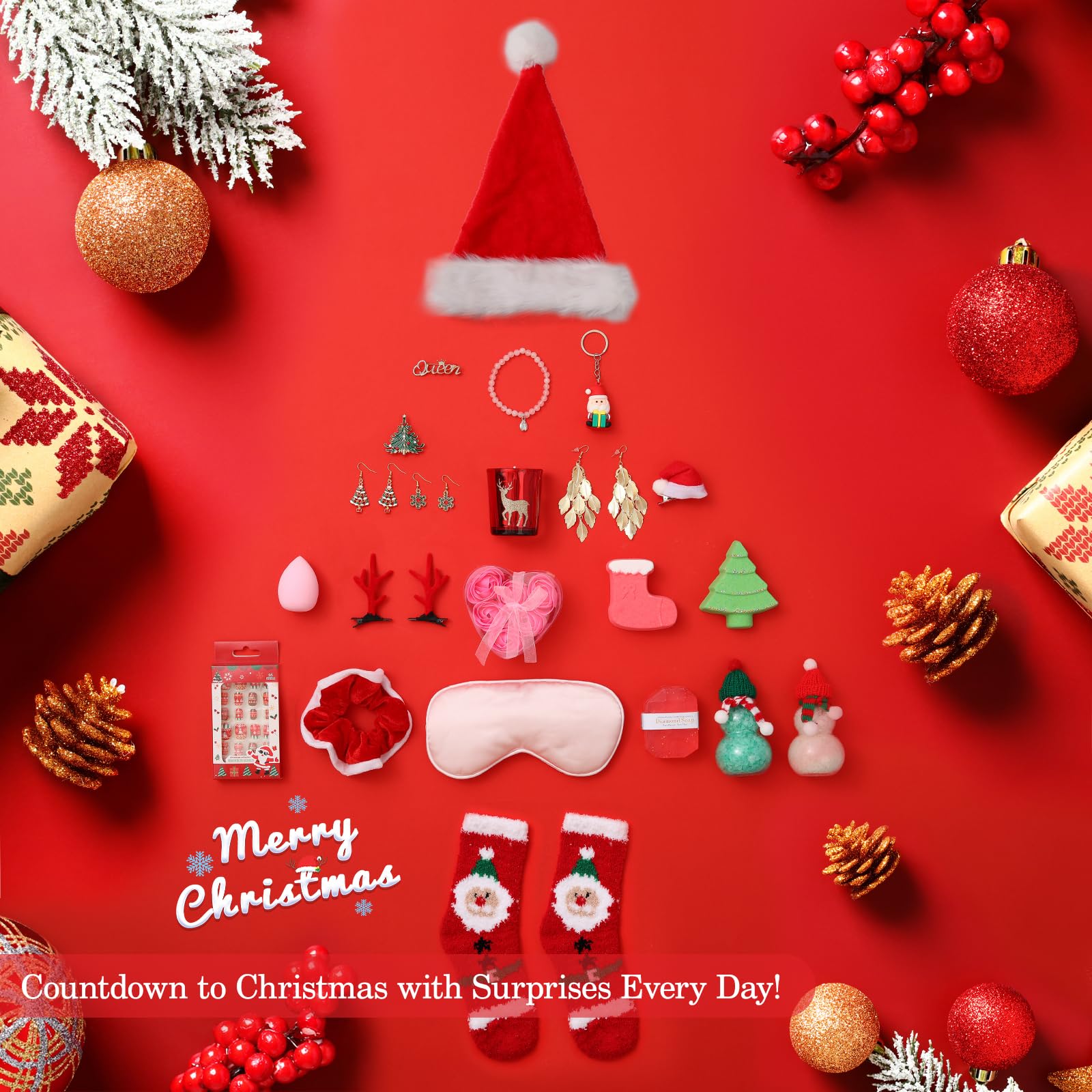 - CHRISTMAS SURPRISES - Includes 24 Christmas surprises, from Christmas decorative ornaments, Christmas stockings, sparkling Christmas earrings which can complement your holiday outfit, daily wear pendants which would upscale your look, The 24 surprises blend comfort, relaxation, and holiday charm, making this gift box a perfect way to celebrate the spirit of Christmas.