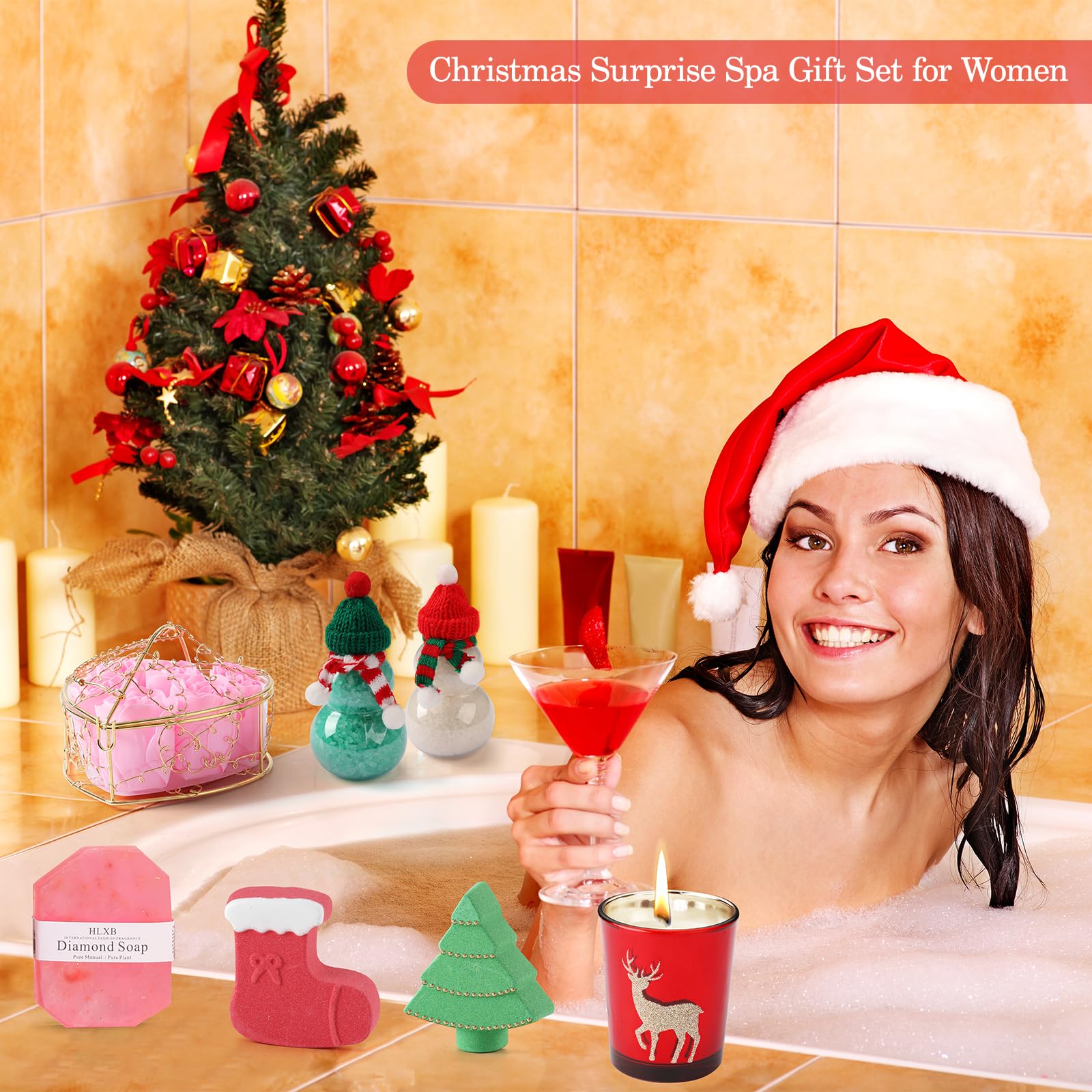 - EXQUISITE GIFT BOX - The Christmas gift is carefully designed and Santa Claus and Christmas trees as the main elements to give you a romantic, fun and unique Christmas atmosphere.Elegant Pink Bracelet, Gentle Pink Sleep Mask, Socks with Christmas elements, Santa Hat.Each surprise is designed to create a serene and cozy holiday atmosphere, making every day leading up to Christmas an indulgent escape.
