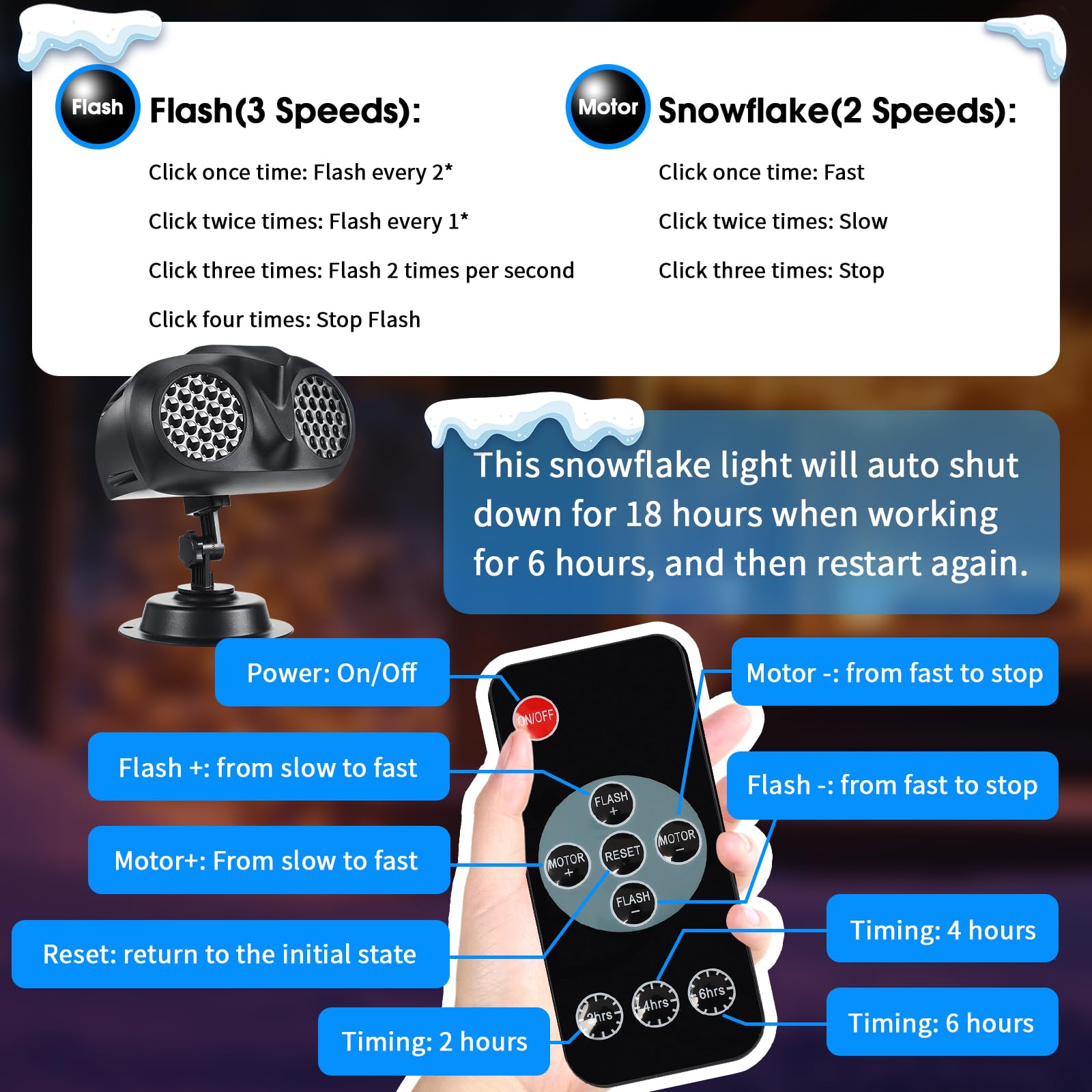 - ❄️Longer Remote Control Distance And Timer: Hsonline Christmas light projector features an upgraded remote control with an impressive 60-foot range. Easily adjust the snowflake patterns to move slowly or quickly, and choose between flashing or steady settings. Additionally, this proyector navidad para exteriores includes a built-in timer with 2-hour, 4-hour, and 6-hour settings, allowing you to set it at night and forget it without the worry of turning it off at sunrise.