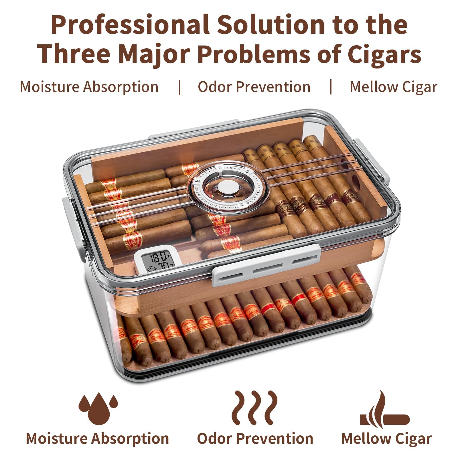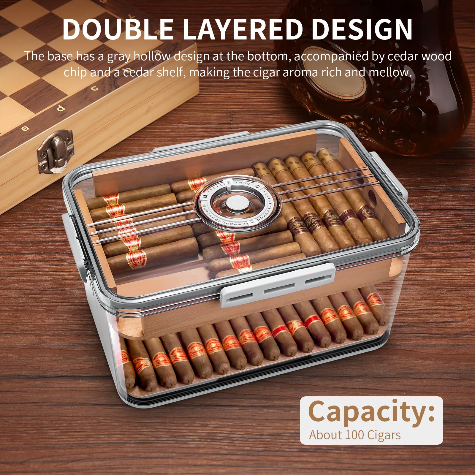 CIGARLOONG Cigar Humidor Large Accommodate 100 Cigars,Built-in Cedar Wood Shelf with High Precision Hygrometer Transparent Cigar Storage Box