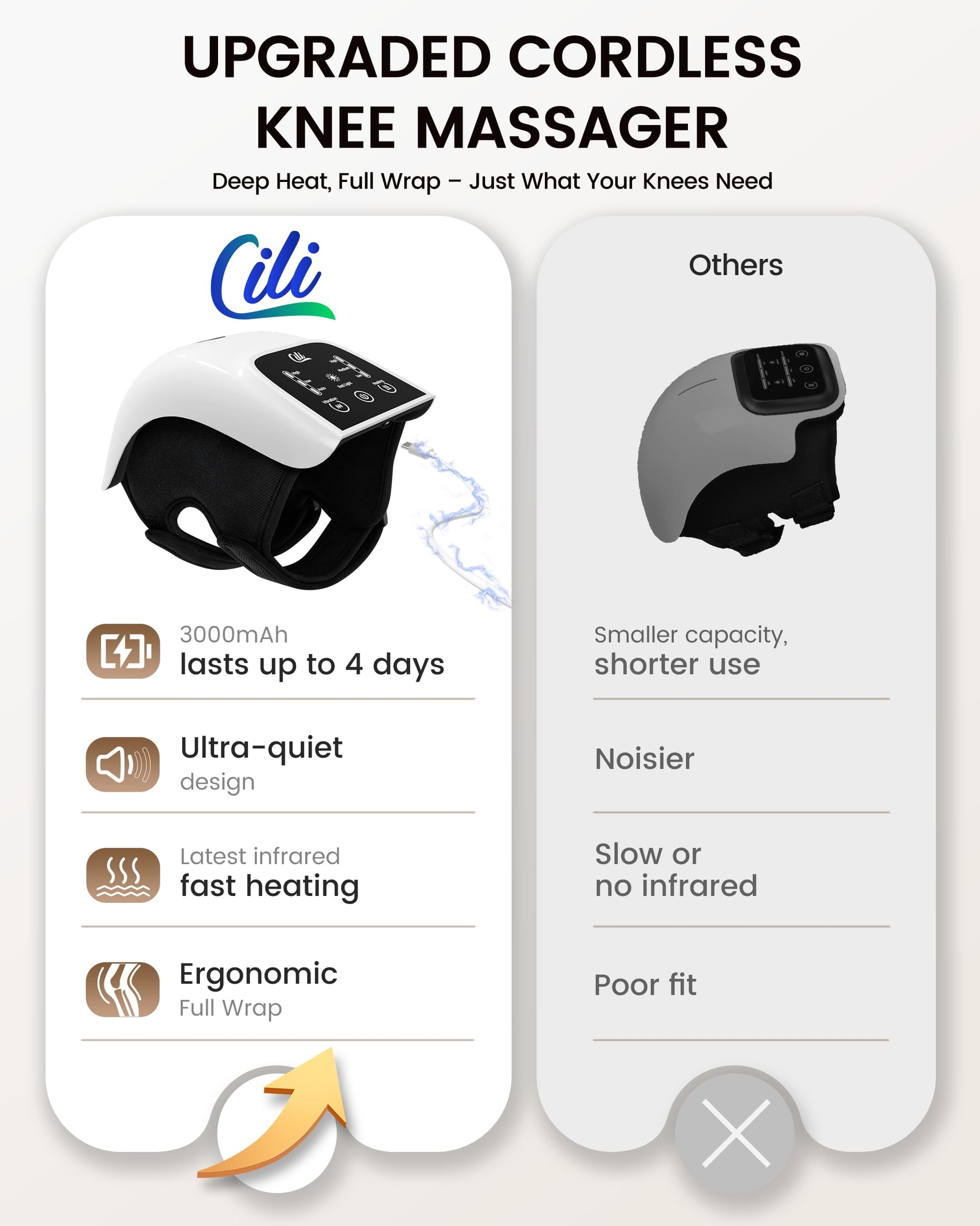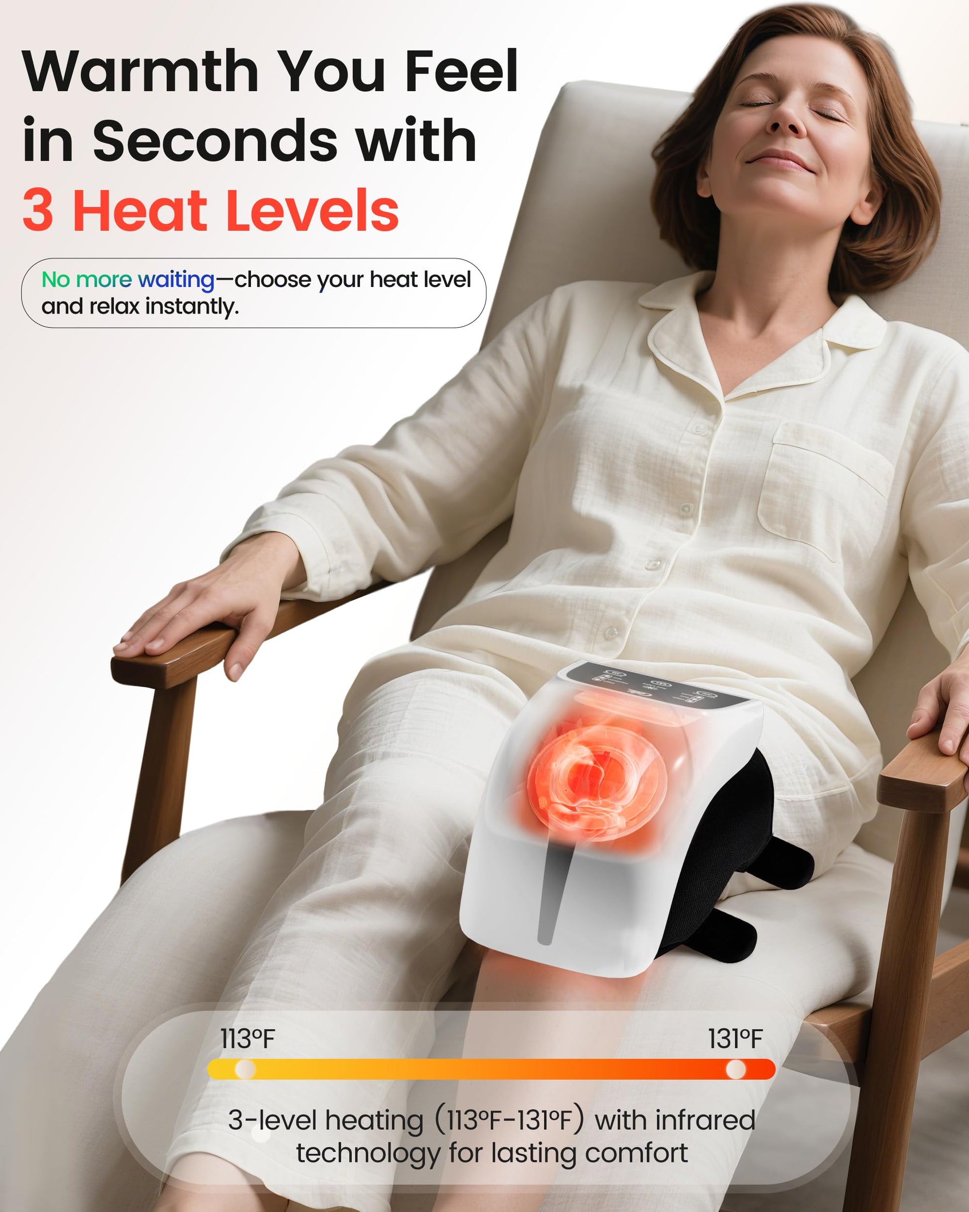 - Fast Warming, Deep Comfort:CILI cordless knee massager with heat delivers gentle warmth in under 60 seconds. With three heating levels (113°F / 131°F / 140°F), you can choose the temperature that feels just right.The built-in advanced heating technology helps maintain a stable warm experience, making it an ideal choice for staying warm on cold days.