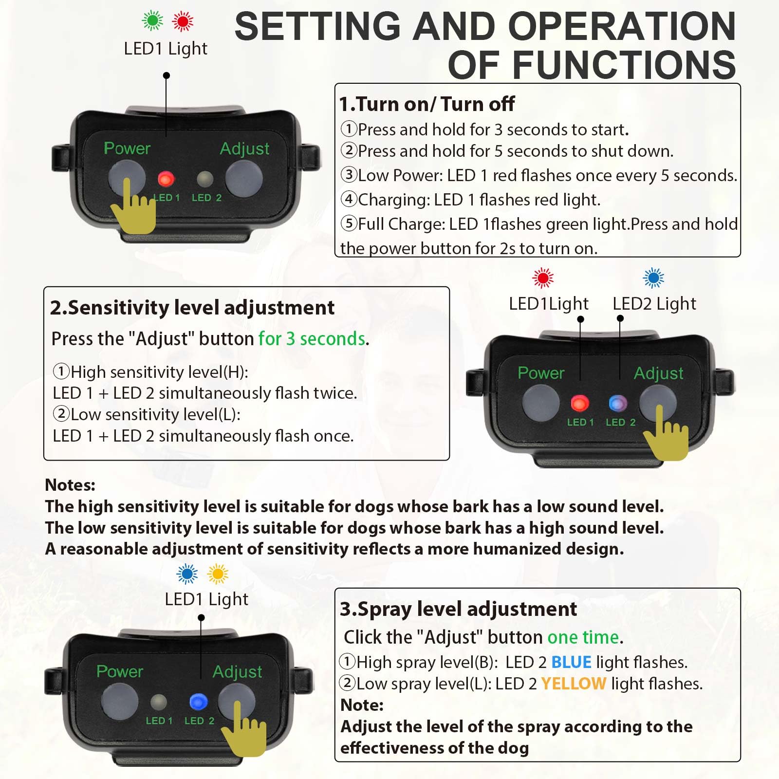 - [Level 2 Sensitivity & Spray Adjustable] Our citronella bark collar has 2 levels of Beep Sensitivity and 2 levels of spray volume adjustable. You can choose the most appropriate sensitivity and spray amount for training according to the environment and the type of dog. The indicator light displays: High sensitivity level(H). Low sensitivity level(L), Please regularly clean any foreign objects on the sensor to avoid clogging the nozzle