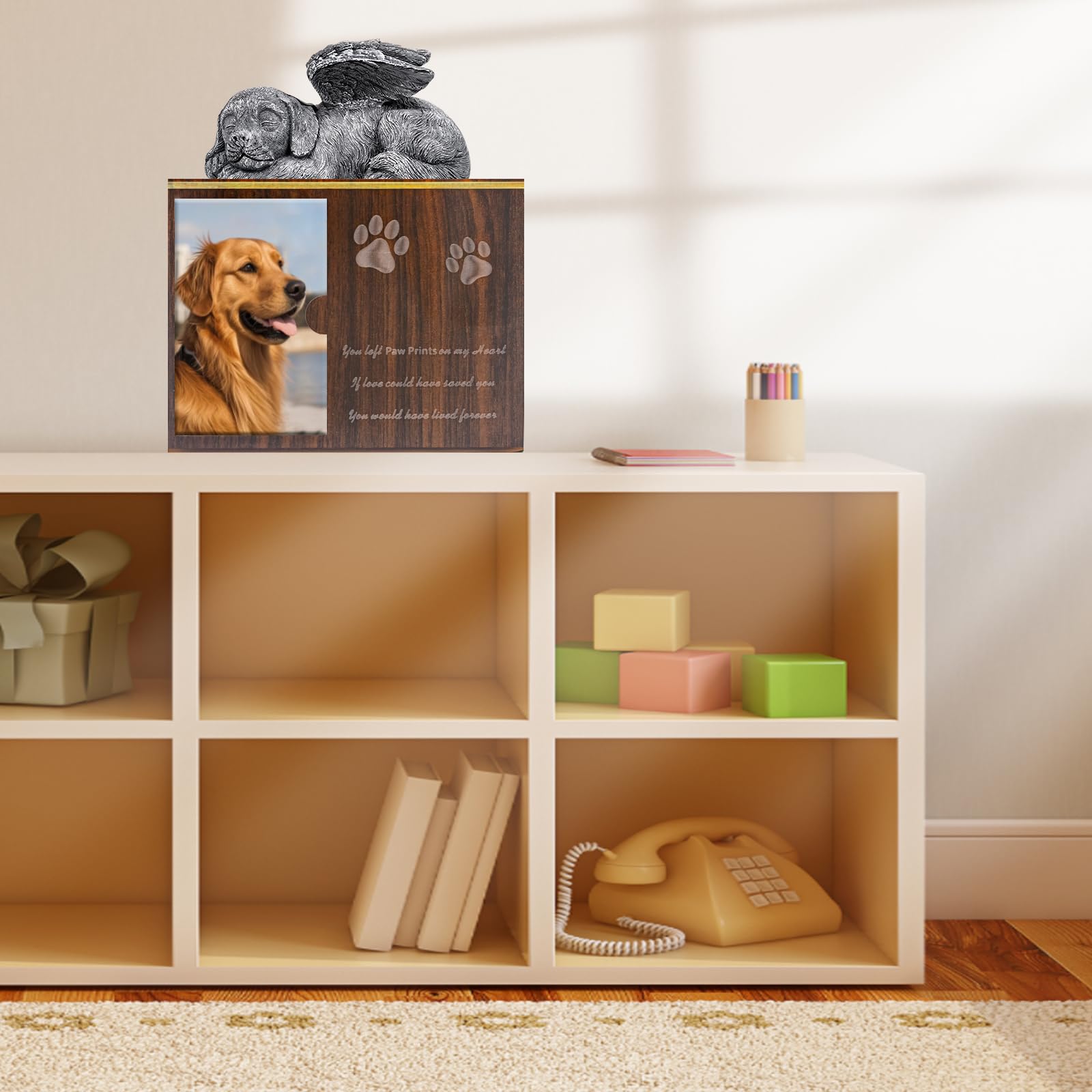 Cityjoy Dog Urn for Ashes, Large Wooden Texture Acrylic Memorial Urn with Angel Dog Statue, Pet Urns for Dogs Ashes Keepsake Box, Sympathy Remembrance Gift for Loss of Beloved Pet Urns for Dogs