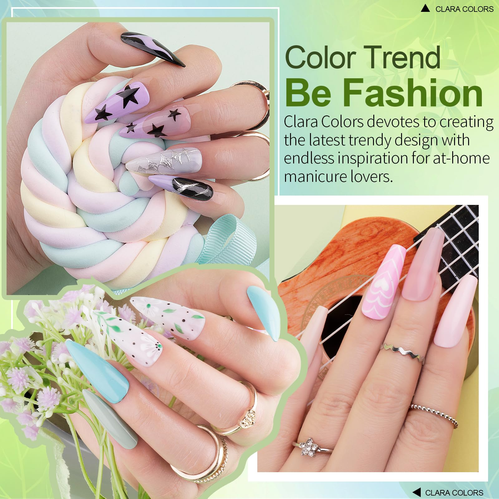 - Clara Colors Spring Nail Art Design: Clara Colors nail color with 60 different shades of popular and trendy colors, suitable for all seasons and daily routine life! To make it easier for you to design your spring and summer manicure, we have thoughtfully included butterfly and flower nail stickers in these gel nail kit. You are free to create floral nail art.