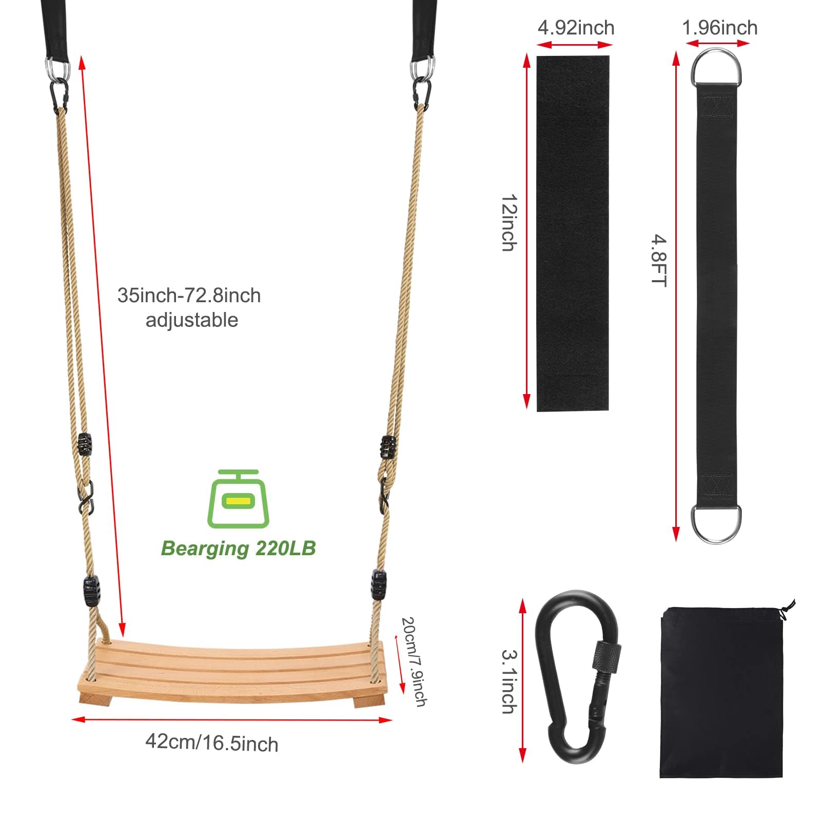 - Comfortable Swing Seat: The swing seat is designed for maximum comfort with a smooth, flat surface and rounded edges . It's perfect for relaxing and enjoying the outdoors.Our tree swing is built with safety in mind, featuring a sturdy construction and a strong rope that can hold up to 220pounds.