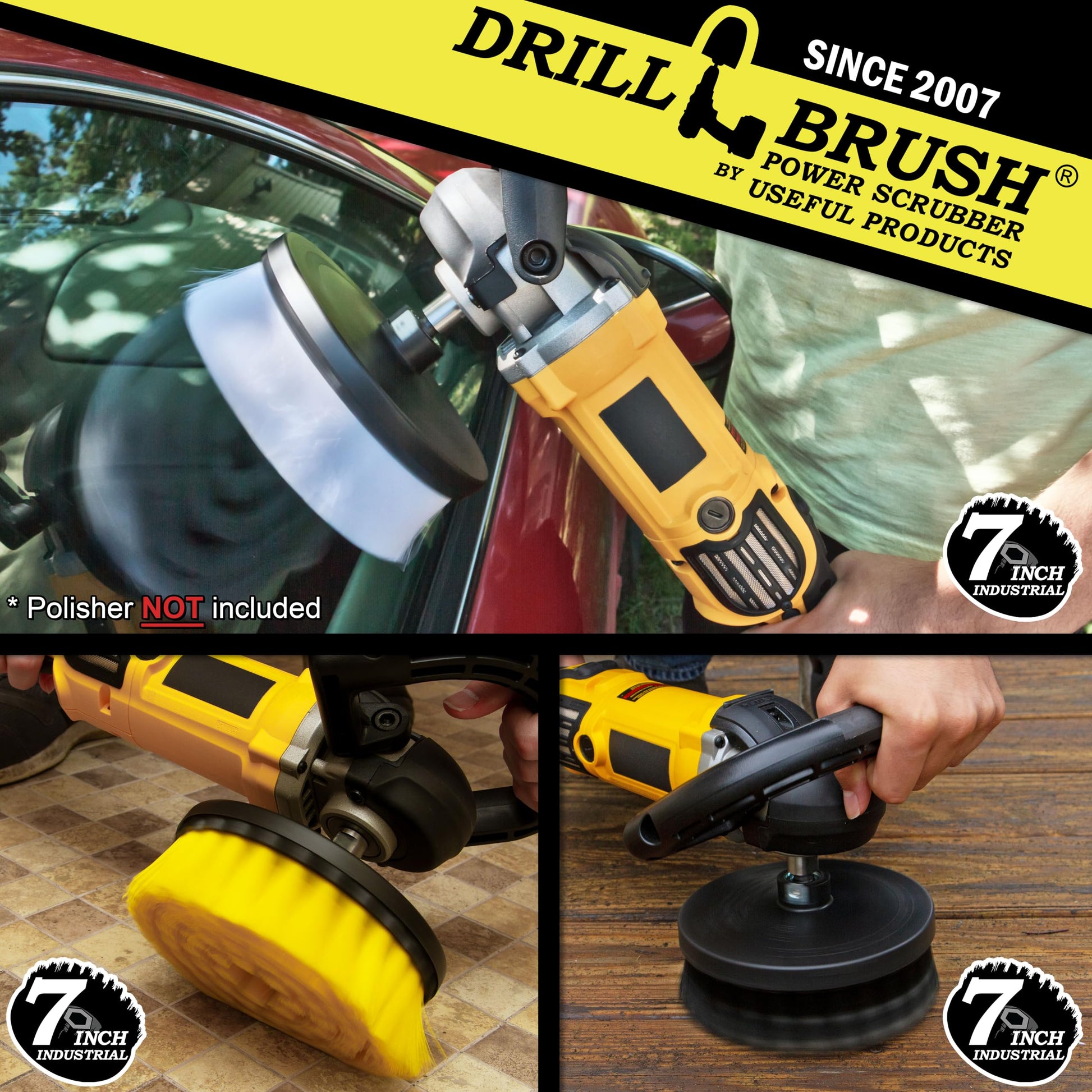 Details: The Drillbrush Industrial line of professional grade cleaning tools are built to meet or exceed contractor standards. The 3 brush 7-inch kit was designed with the professional in mind to get a variety of scrubbing tasks done faster and better. Popular with general contractors, fabricators, painters, marinas, welders, auto re-conditioners, masons, bricklayers, cabinet makers, and with all types of commercial cleaners. Institution, Facility, and Hotel cleaning contractors can benefit from the greatly increased speed compared to hand scrubbing. The Soft White brush is ideal for cleaning and scrubbing carpet, wood, glass, leather, facility seating, and furniture. The Medium Yellow brush is for cleaning and scrubbing Bathrooms, Tile, Tubs, Shower, Porcelain, and Flooring. The Ultra Stiff Black brush replaces traditional wire brushes and is suited to cleaning and scrubbing Grates, Stone, Grills, Furnaces, and other industrial applications. Fits these and other 7in / 9in Variable Speed Polisher machines with spindle thread 5/8 x 11: DEWALT DWP849X 12 Milwaukee 5540 Milwaukee 2738-22 M18 FUEL All Drillbrush Products have a 90 day no questions asked Money back guarantee. If you are not completely satisfied with our product we will issue a full refund or ship out a replacement at the buyer's request.