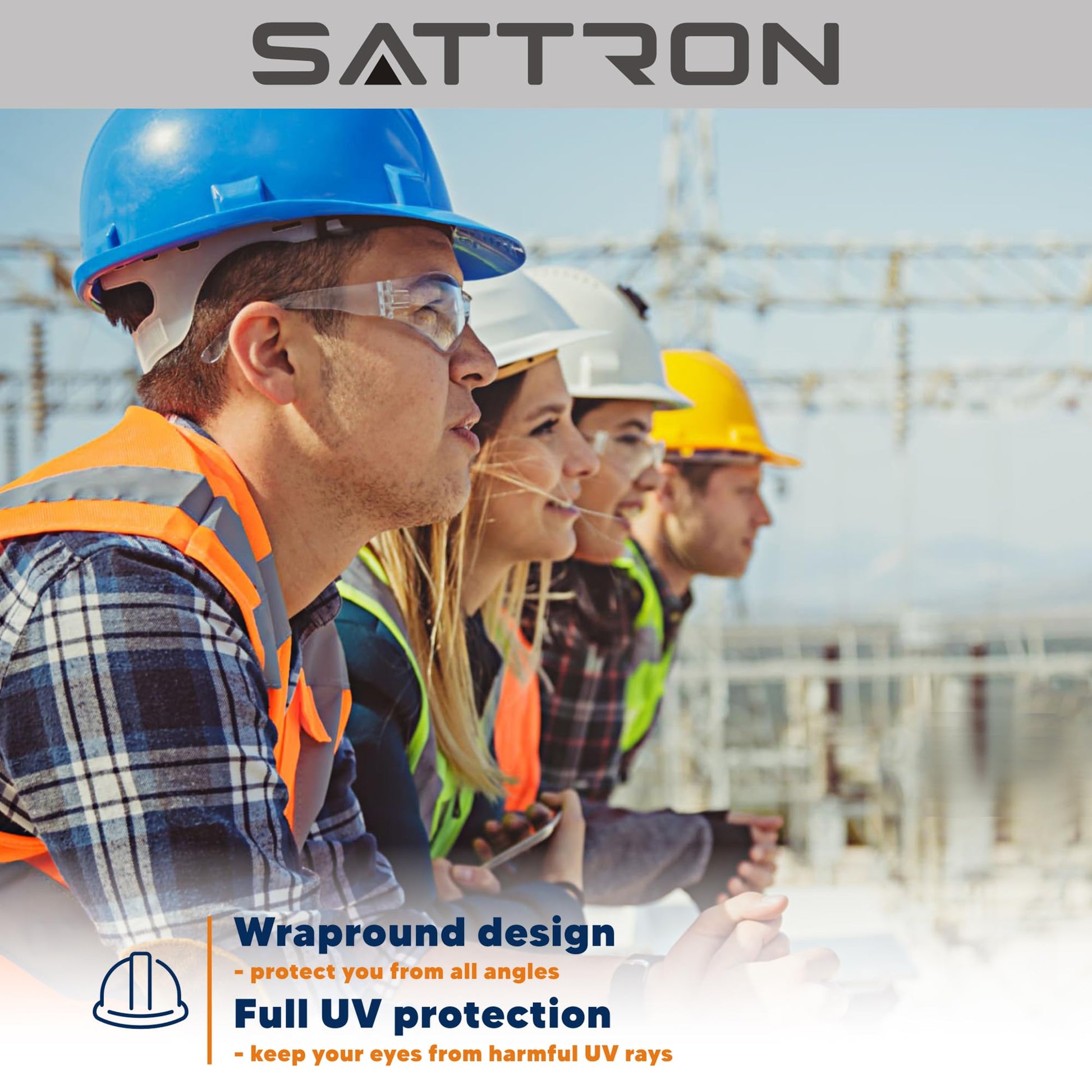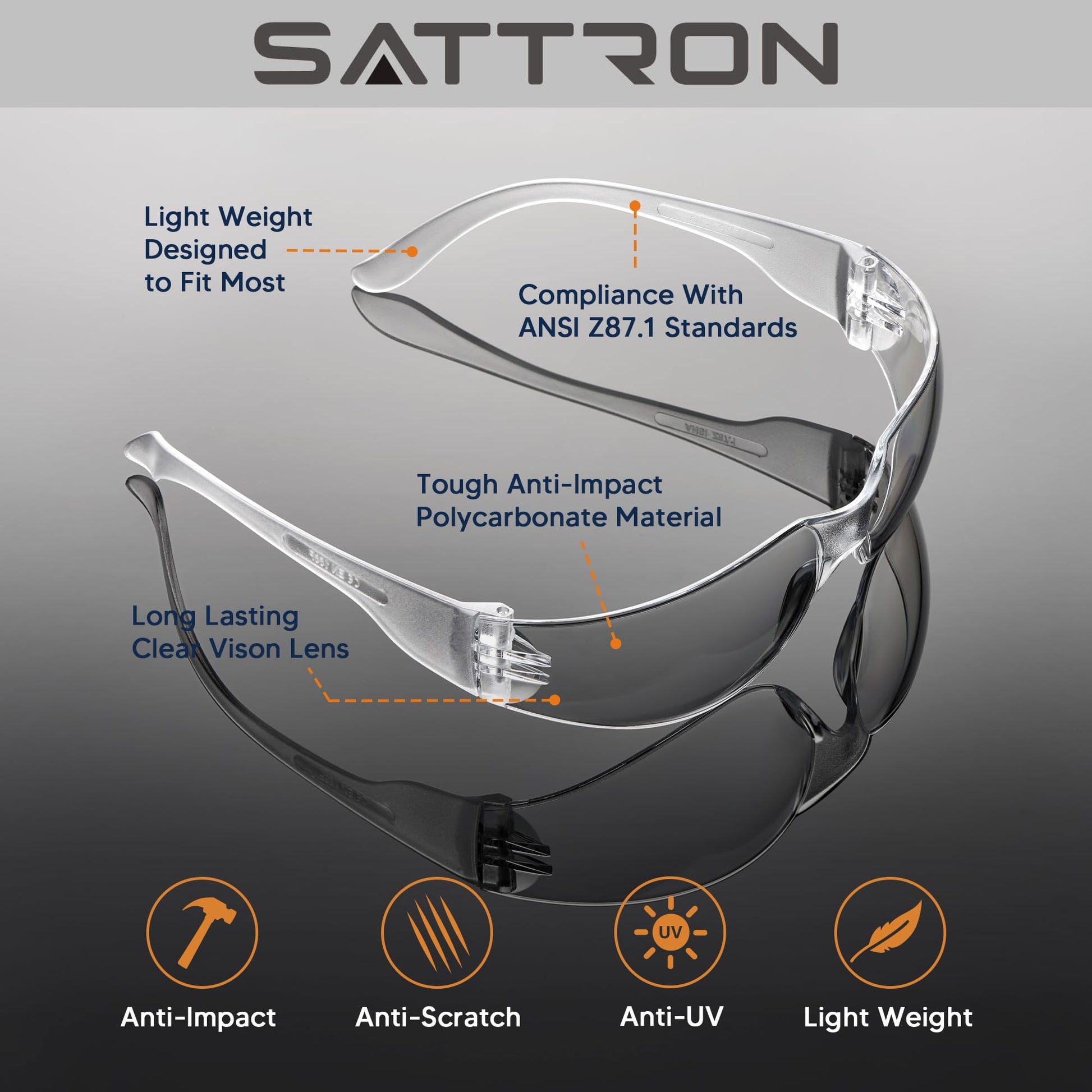 - 【INDUSTRIAL GRADE PROTECTION】SATTRON eye protection meets ANSI Z87.1 Standards. Each pair of glasses is impact, ballistic and scratch resistant tested, protect you from flying debris and particles. High quality polycarbonate lenses can help you block 99.9% of harmful UVA/UVB rays.