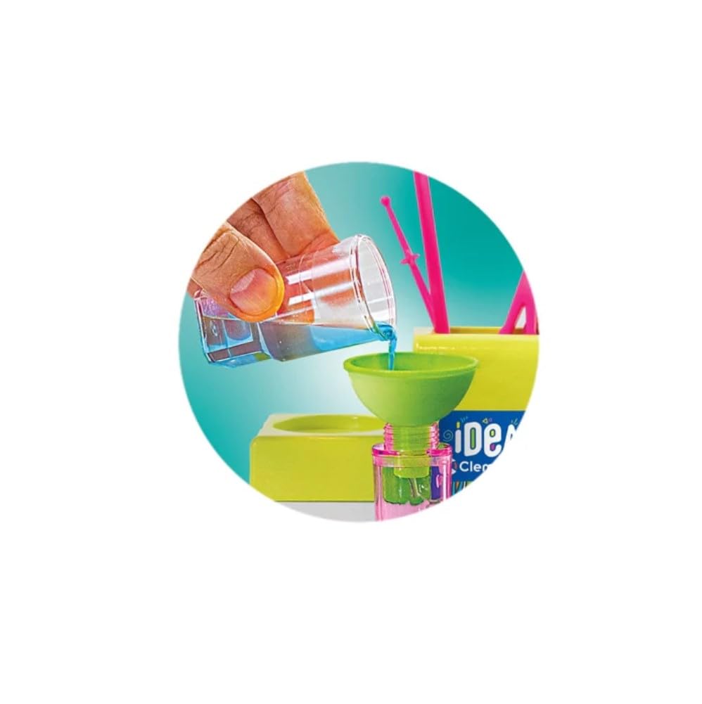 Contenu: Base avec compartiments et support, Entonnoir, instruments, pieds antidérapants, 6 mini surligneurs avec bouchons coloré, 5 couleurs différentes, 6 corps transparents à décorer, 6 bouchons blancs en caoutchouc, 5 sachets de décoration irisées de formes et de couleurs diverses, 1 sachet d’anneaux colorés, 1 sachet de pompons colorés, décoration en plastiques à composer, 1 cordon élastique, 6 personnages en cahoutchouc, présentoire pour les surligneurs, autocollants colorés, manuel illustré.