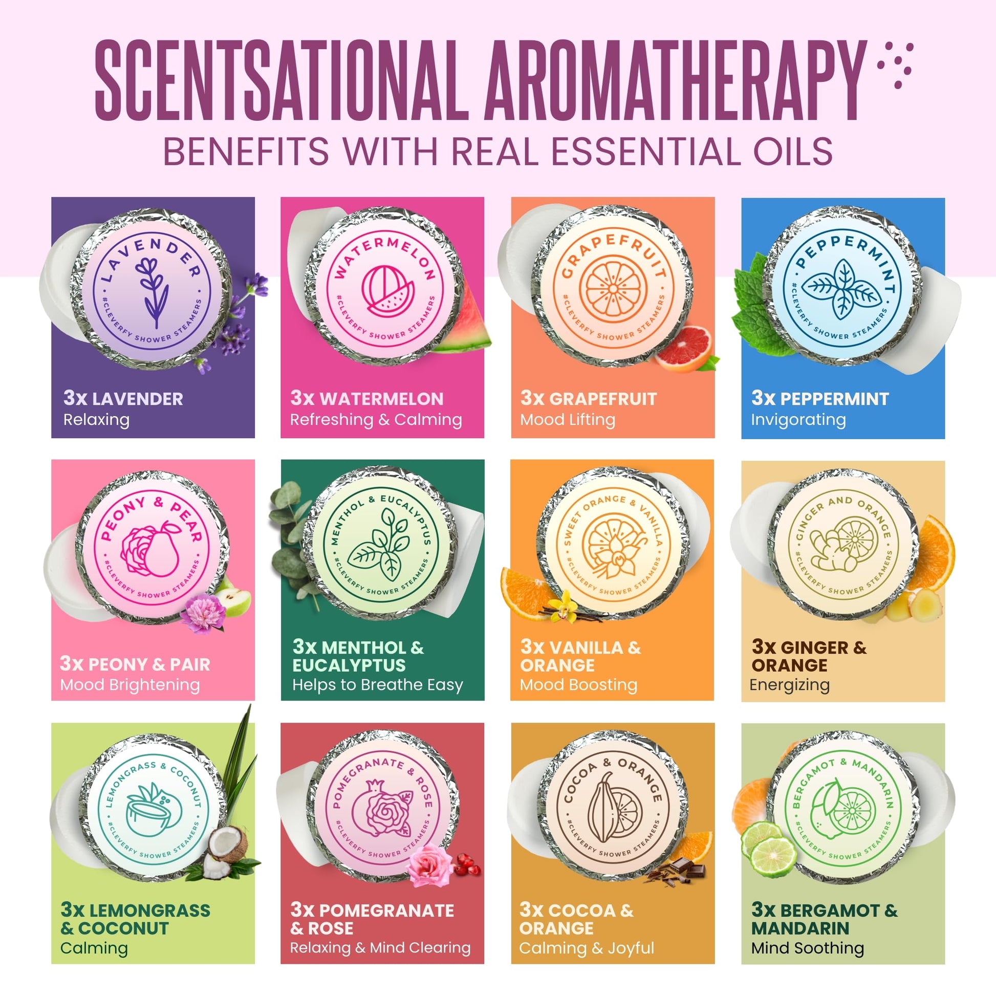 - Scent-Sational: This 36-pack includes 3x Lavender, 3x Watermelon, 3x Grapefruit, 3x Menthol & Eucalyptus, 3x Vanilla & Orange, 3x Peony & Pear, 3x Cocoa & Orange, 3x Bergamot & Mandarin, 3x Ginger & Orange, 3x Pomegranate & Rose, 3x Lemongrass & Coconut, and 3x Peppermint.