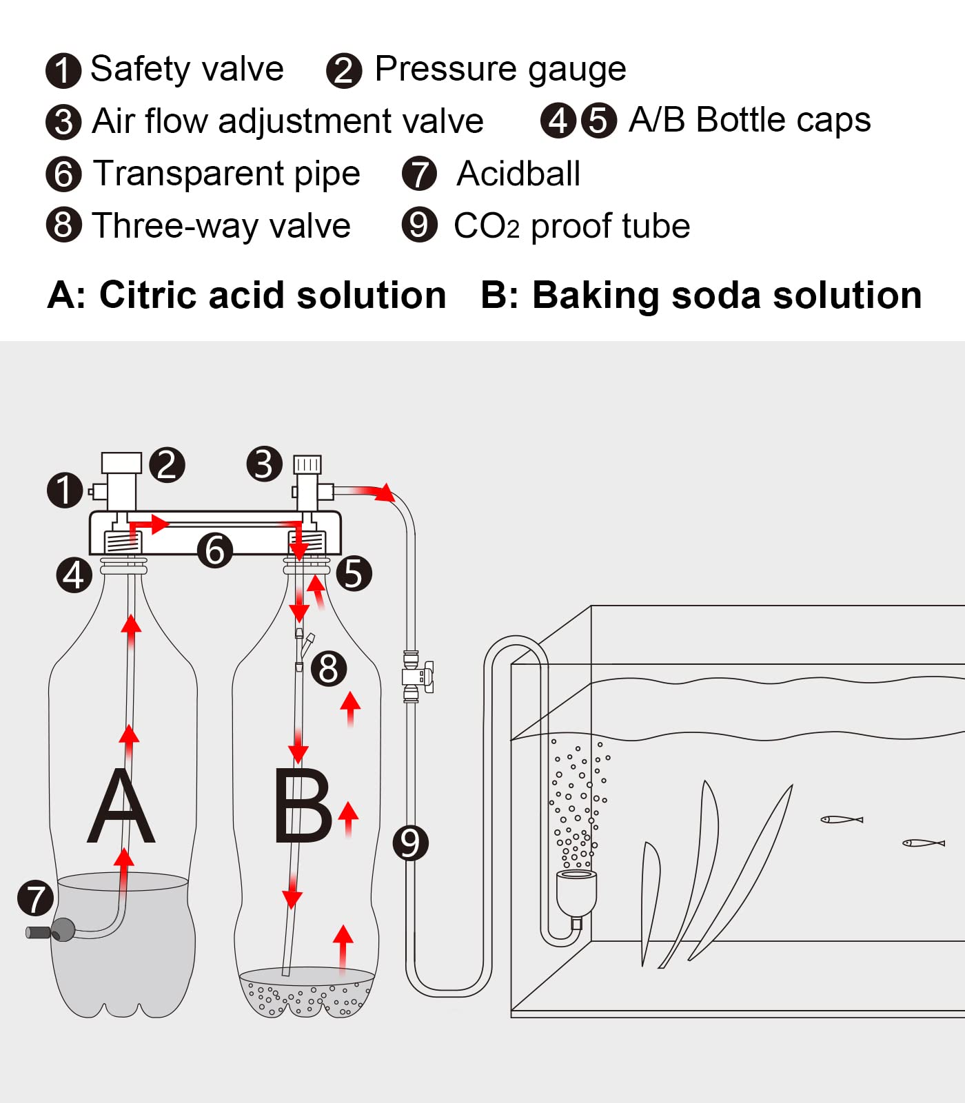 - Our CO2 Generator Kit includes most of the accessories. You only need to prepare yourself: 2 additional carbonated beverage bottles (preferably for 2L), e.g. Coke or Sprite; reaction materials: baking soda and citric acid; check valve and CO2 diffuser.