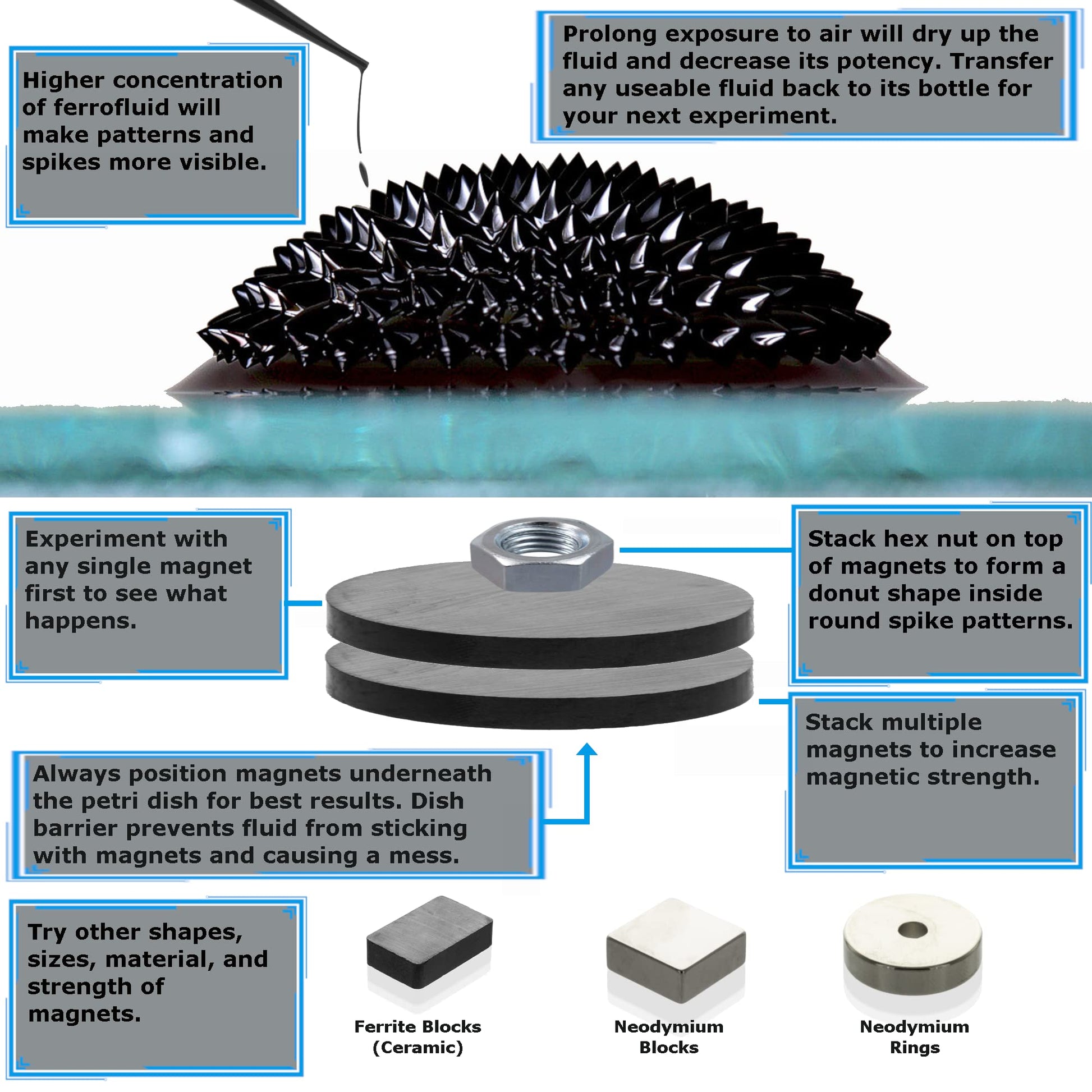 - EDUCATION - These ferrofluids are specifically designed for use in classrooms, schools, and museums. They feature magnetic properties that make it easier to visualize the magnetic patterns. They're also great for DIY science projects and other thought provoking science experiments. When not in use, please store away in the ferrofluid bottle sealed tight. Long exposure to air may dry the fluid and reduce it's potency to perform visual displays.
