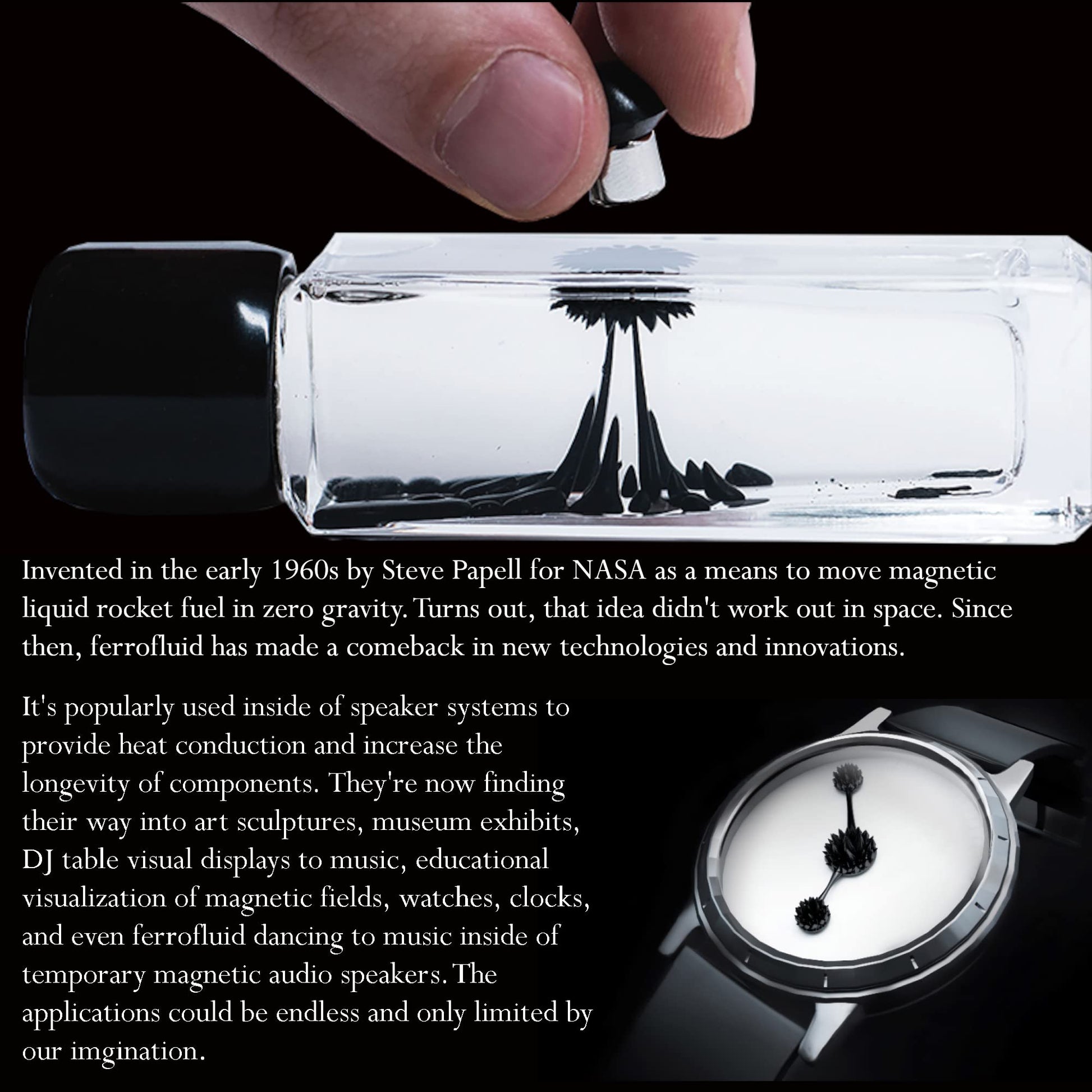 - APPLICATIONS - EFH1 model is used for education in magnetism, visual art displays, visual music displays, visual technology displays in clocks, watches, and even ferrofluid dancing in non-permanent magnetic speakers. The endless possibilities for ferrofluid applications is only limited by your imagination. This model is not to be used as a cooling system for audio speaker systems.