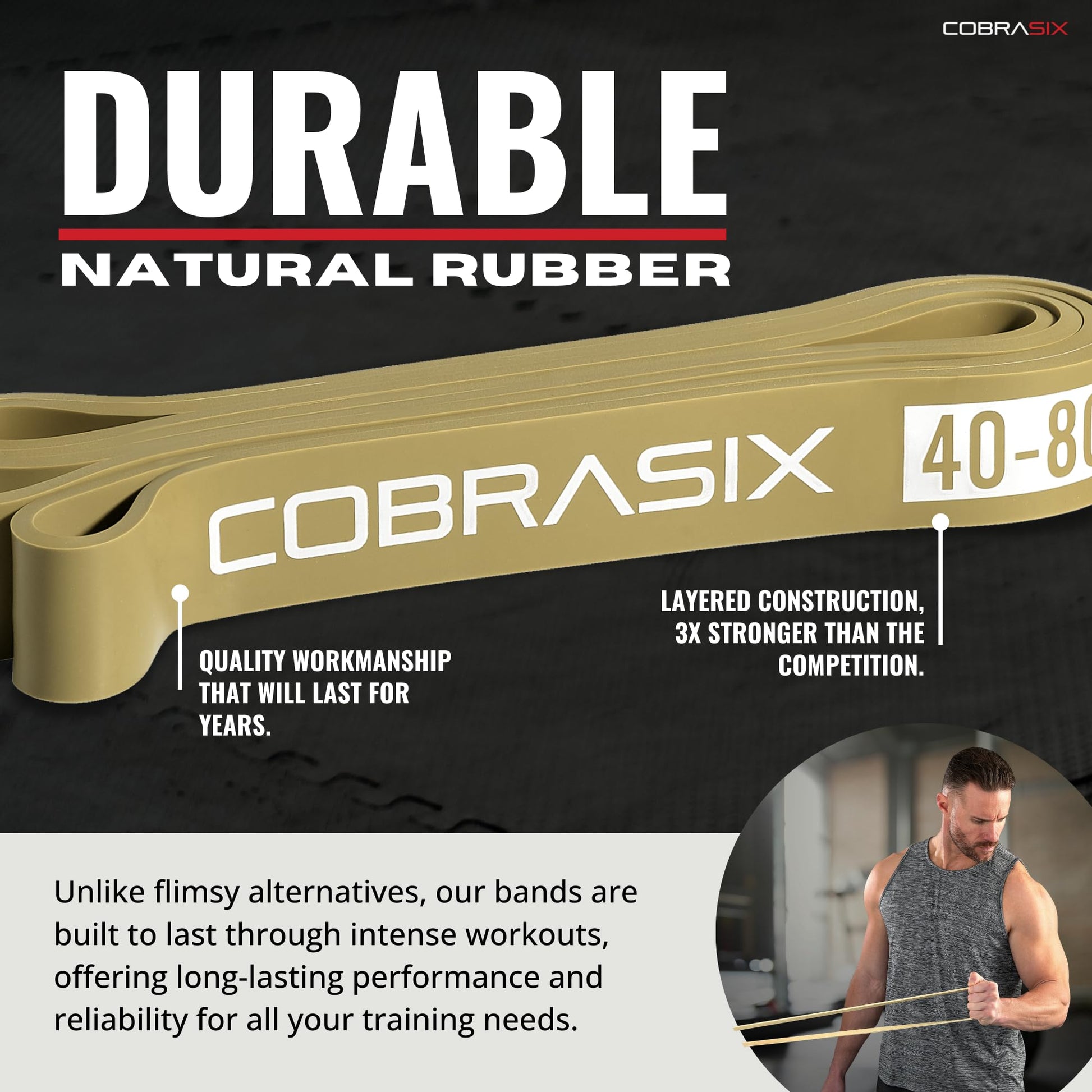 - DURABLE NATURAL RUBBER! CobraSix natural latex rubber resistance bands with layered construction are 3x more durable than other elastic bands for exercise. The fitness bands also come with strong rubber handles, attachement hooks and a door anchor for resistance bands