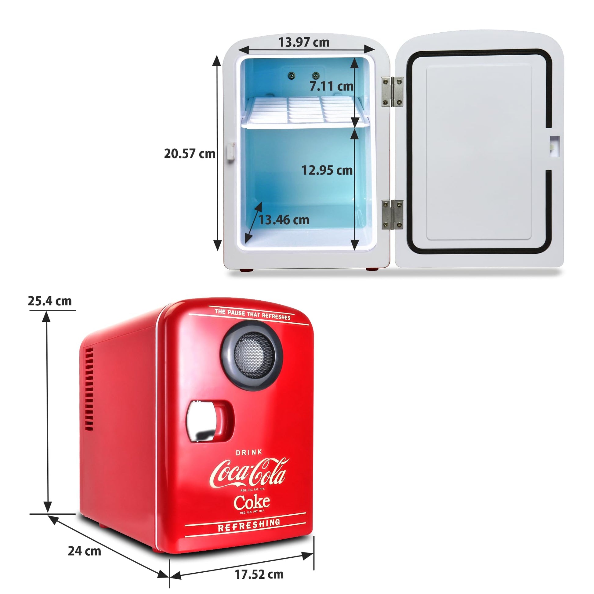 Coca-Cola 12V Portable Built in Speaker with 4L Mini Fridge, Compact Speaker and Personal Cooler/Warmer for Desk Office Dorm, Unique Gift for Music-Lovers and Students