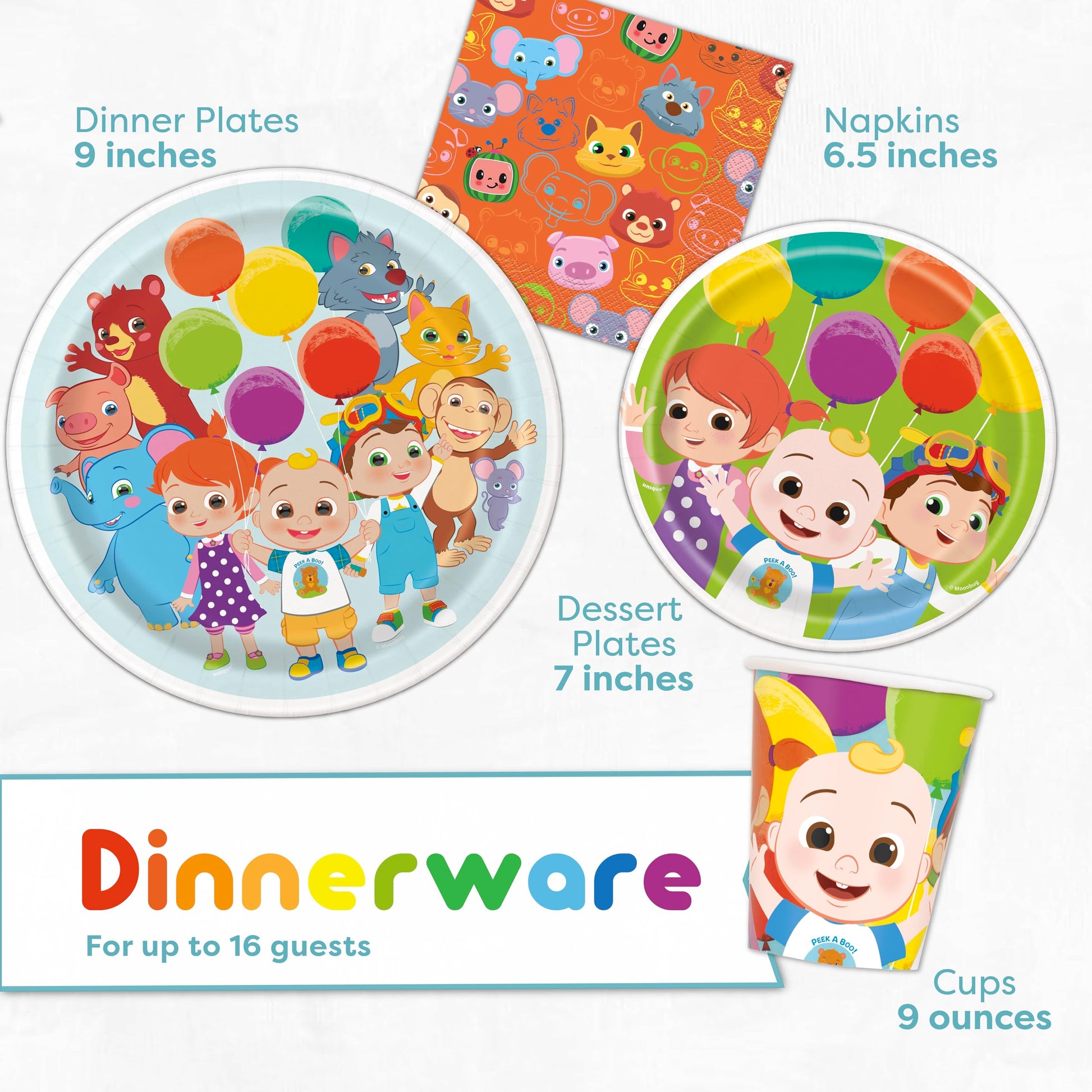 - Total Pieces -- This set includes enough Cocomelon themed supplies to host a party of 16 guests: 1 plastic table cover / tablecloth, 1 "Happy Birthday" banner, 16 large 9" paper plates, 16 small 7" paper plates, 16 paper napkins, 12 coordinating candles, and 1 Happy Birthday sticker.