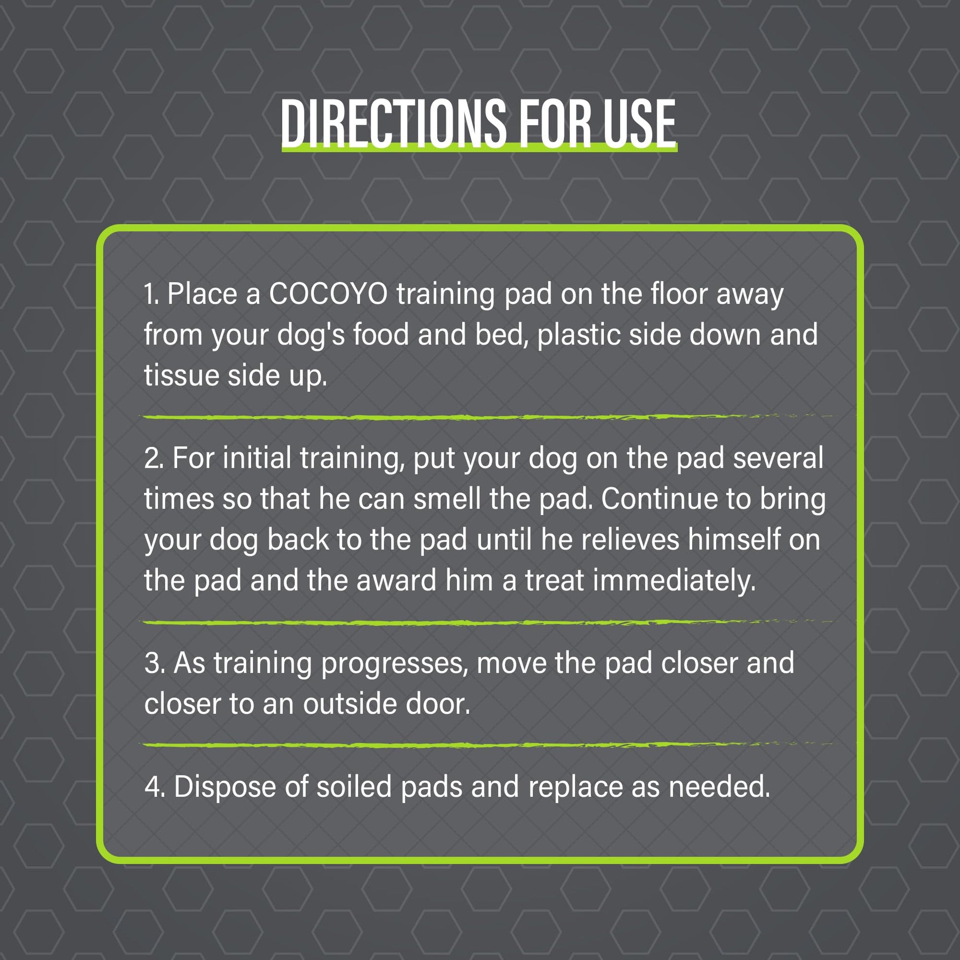 - Suitable for Dogs of All Ages — The COCOYO training pads can be used for dogs of all ages and breeds, perfect for puppy potty training, sickness recovery, stay-at-home for long time and traveling.