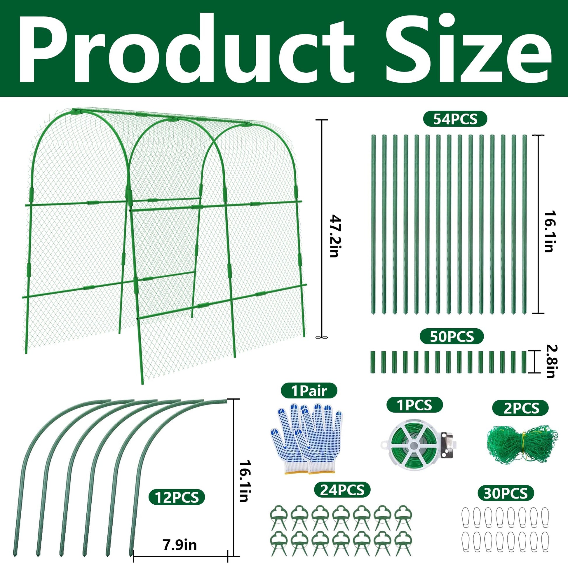 - Product Details: The size of garden bean tower plant trellis for climbing plants outdoor stand is 47 x 47 inch. 30 x metal clips, 24 x plastic clips, 1 pair work gloves, 2 x climbing nets, 1 x binding iron wire, 50 x connectors, 54 x straight pipe, 12 x curved tube, come with instruction.