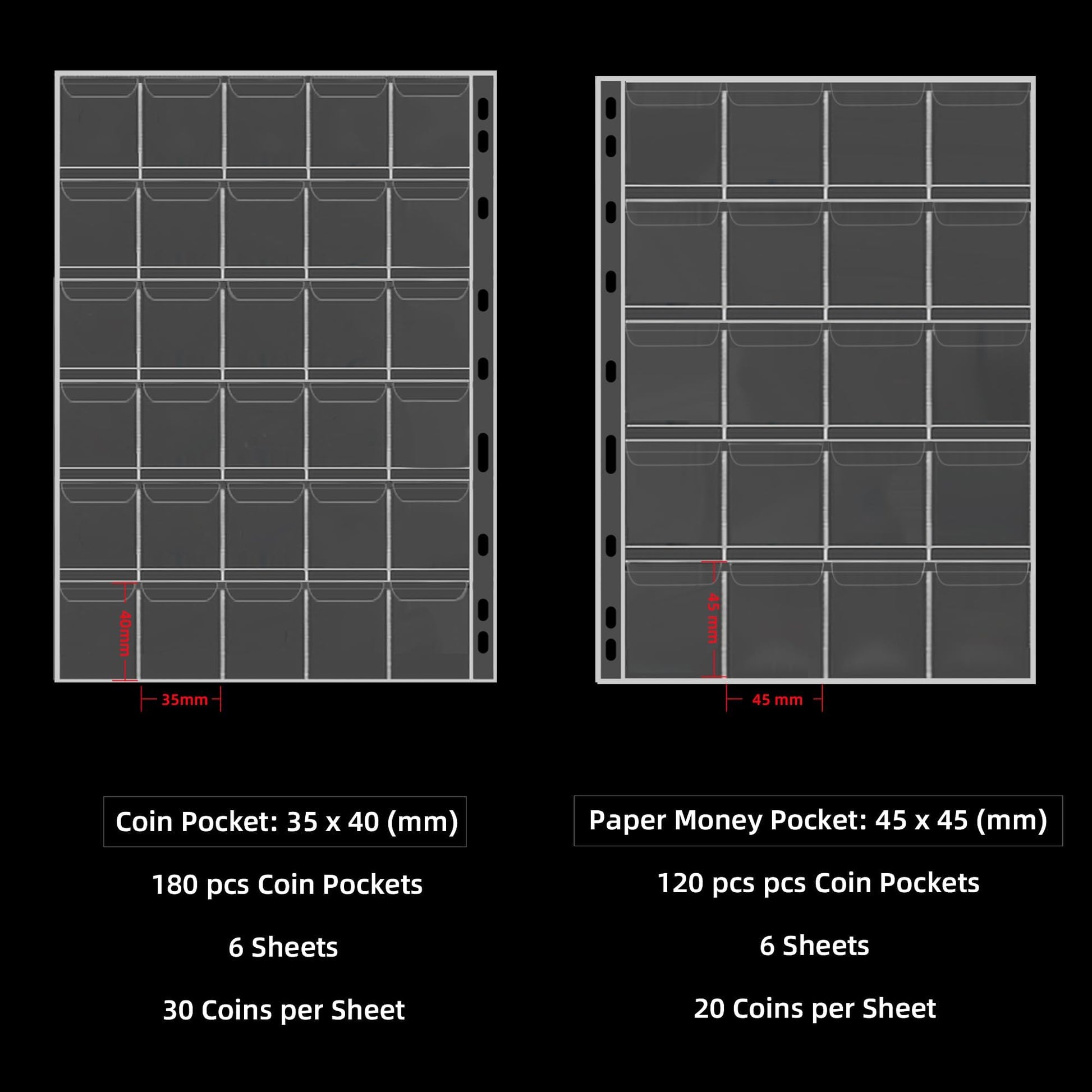 - Large Capacity for less than 45mm Coin and Currency:currency collection book has 12 pages plastic sheets for pennies, quarters, Silver Eagle, silver gold dollars, half dollars, silver bullion, challenge coins, and more coins(not exceed 45mm), 20 pockets per page total for over 120 coins and 30 pockets per page total for 180 coins , currency album comes with 12 page bill currency sleeves total 36 pockets for paper, money, stamp collecting supplies