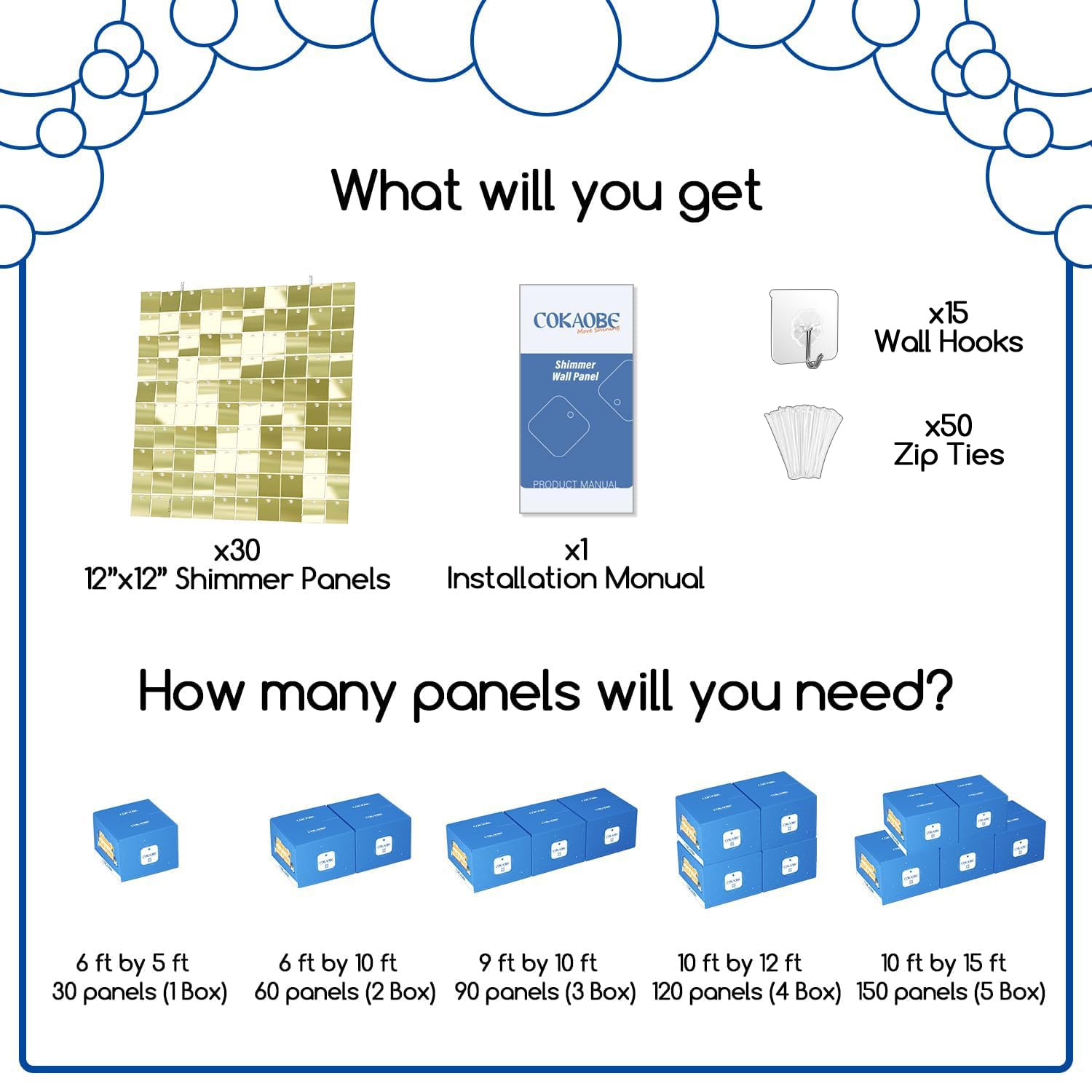 - Great Value Packaging: You will get: 30pcs 12” x 12” (30cm x 30cm)high-quality light gold shimmer sequin wall panels, 50pcs zip ties, 15pcs wall hooks, 1*installation manual. This great value pack allows you to build the perfect light gold Shimmer Wall Backdrop without additional accessories.