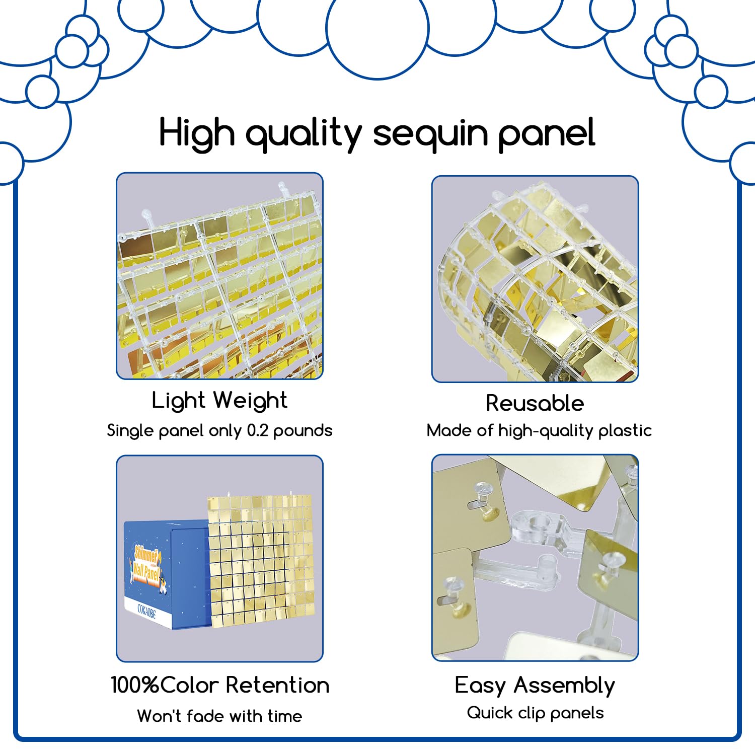 - Premium Quality: This shimmer wall backdrop rose gold sequins panels is made using high quality raw materials. Not easy to break, can be reused. Each Sequins Panels is shiny. Sequins will shine even more in the sun or light.