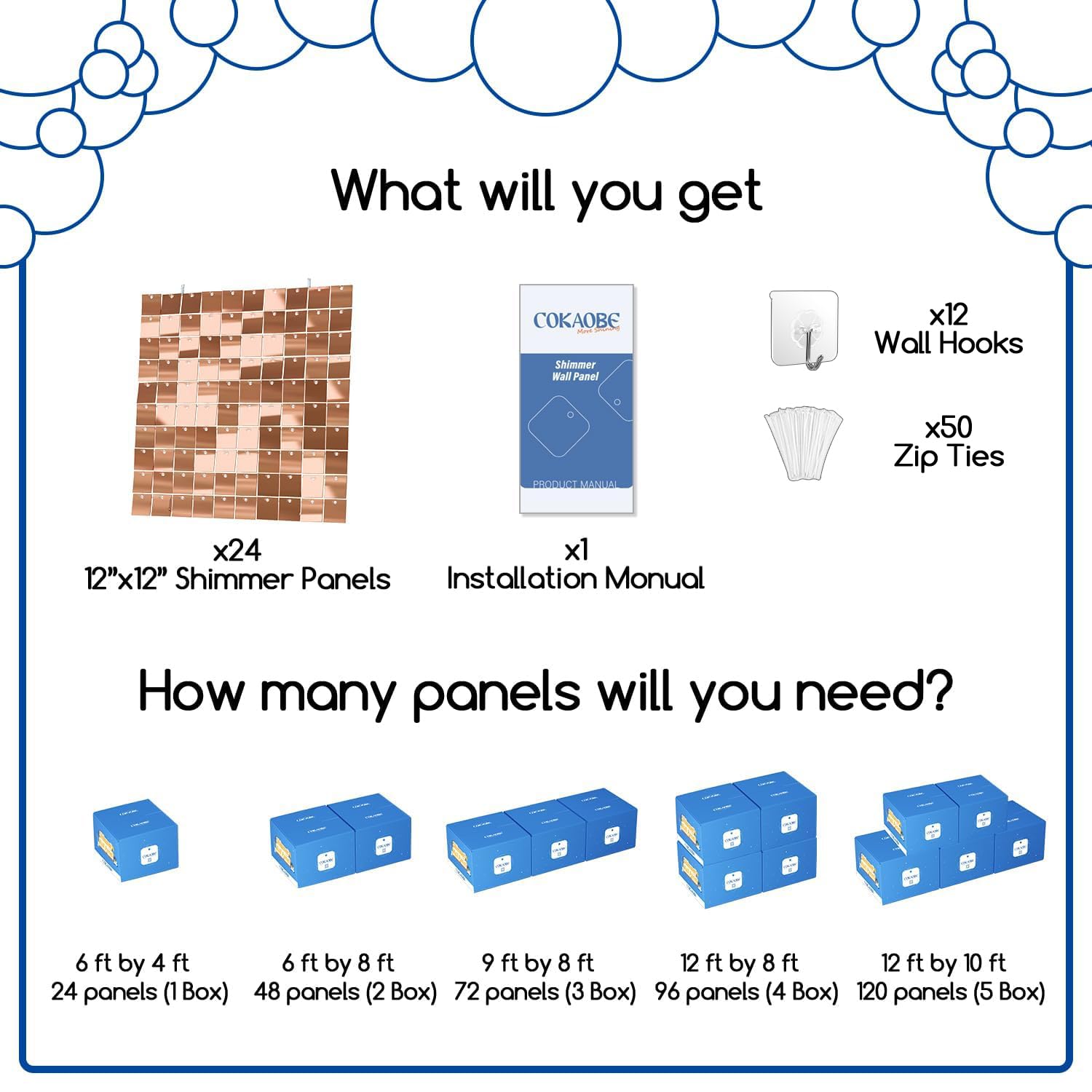 - Great Value Packaging: You will get: 24PCS: 30*30cm high quality shimmer wall backdrop rose gold sequins panels. We provide enough zip ties (50pcs) and wall hooks (12pcs) to support the weight of the wind panel. And come with 1*installation manual. Can meet any of your needs.