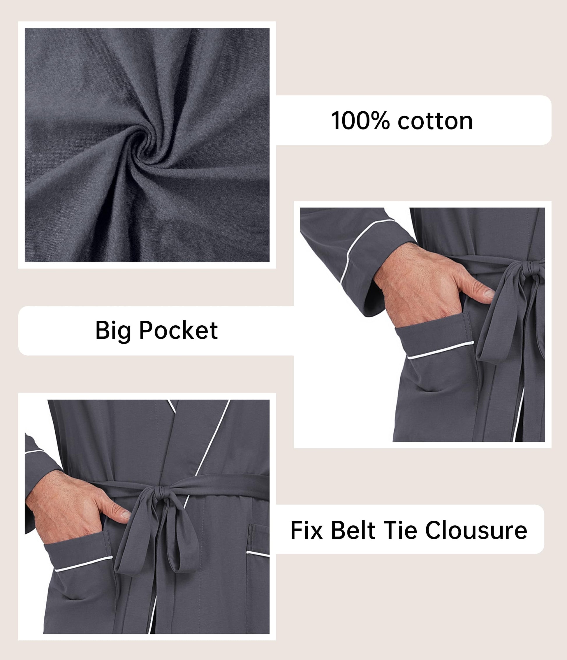 - CLASSIC DESIGN : Our lightweight cotton bathrobe feature two pockets to keep your hand warm and hold small things; Classic shawl collar looks enough sturdy and tasteful; Contrast piping stitching on cuffs, pockets and edges