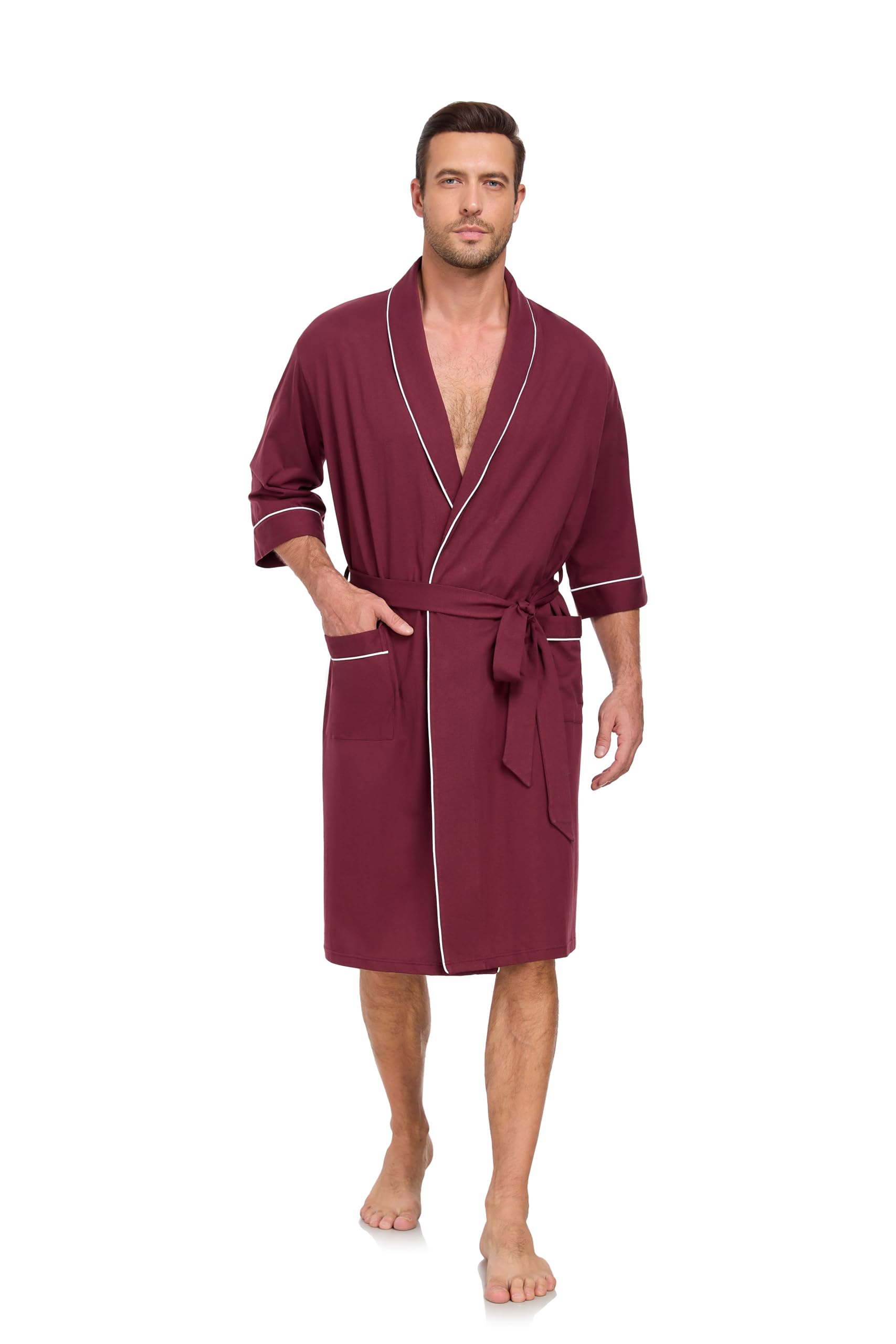 COLORFULLEAF Men's Bathrobes 100% Cotton Soft Comfort Breathable Short Sleeve Summer Kimono Mens Lightweight Robe, Burgundy, Large