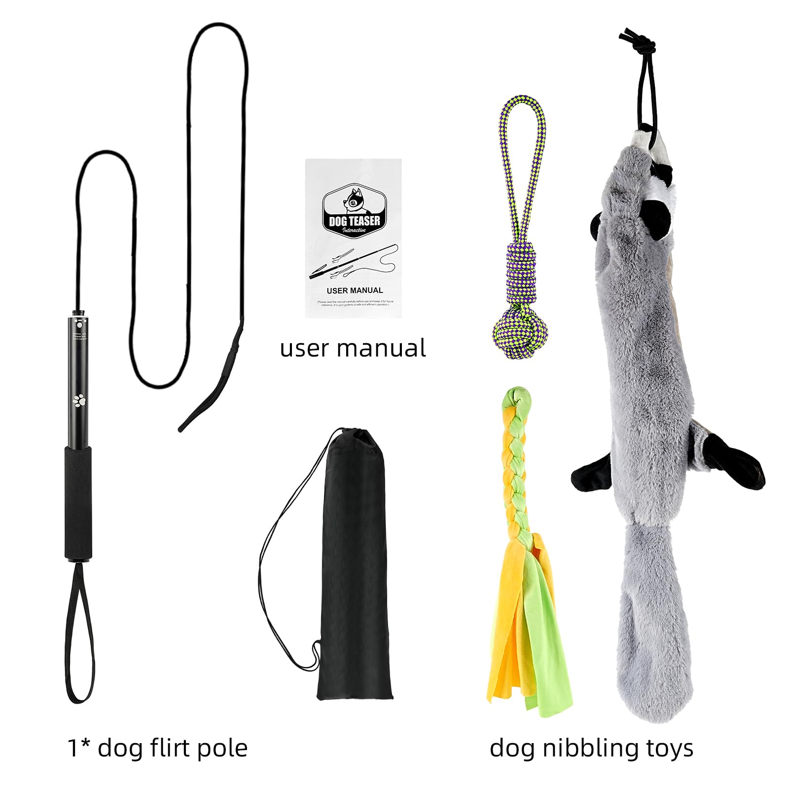 - [Great Dog Flirt Pole for Dogs]: The interactive dog toy is one of the best training tools for realizing the natural instincts of your dog by chasing and tug of war. The dog catches the dog chase toy by sprinting, changing direction, and jumping, transforming the predatory instinct into movement and releasing excess energy, which protects your furniture from damage. Also, this teaser dog flirt pole can promote mutual communication between you and your dog during entertainment time.
