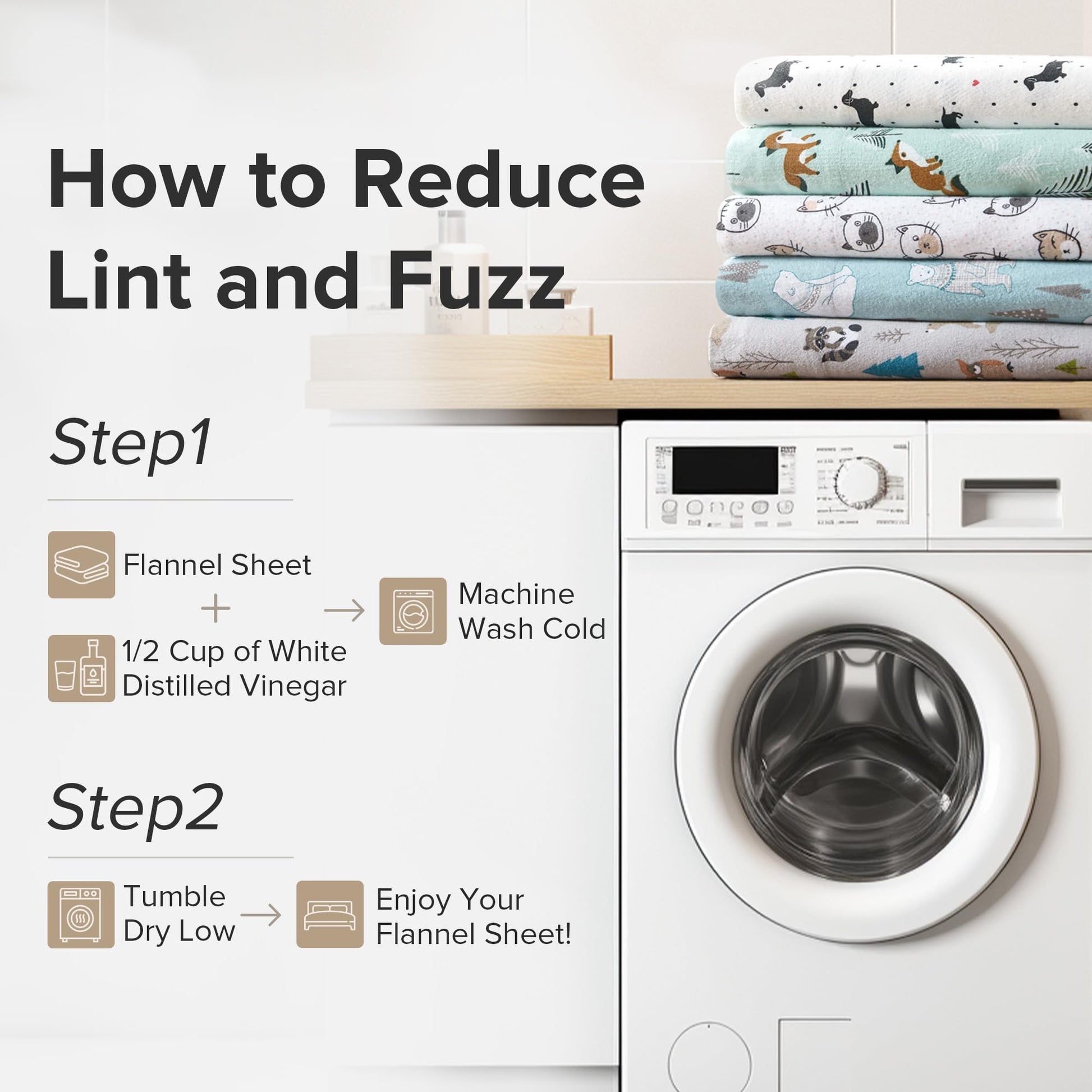 - EASY CARE: Do not Bleach. Machine Wash Cold, Tumble Dry Low. Lint is a natural by-product from the brushing process to create the soft and cuddly flannel fabric. To help settle the fiber, you may add a half cup of vinegar to the washing machine's wash cycle in place of detergent. After the first few washes, shedding should subside.