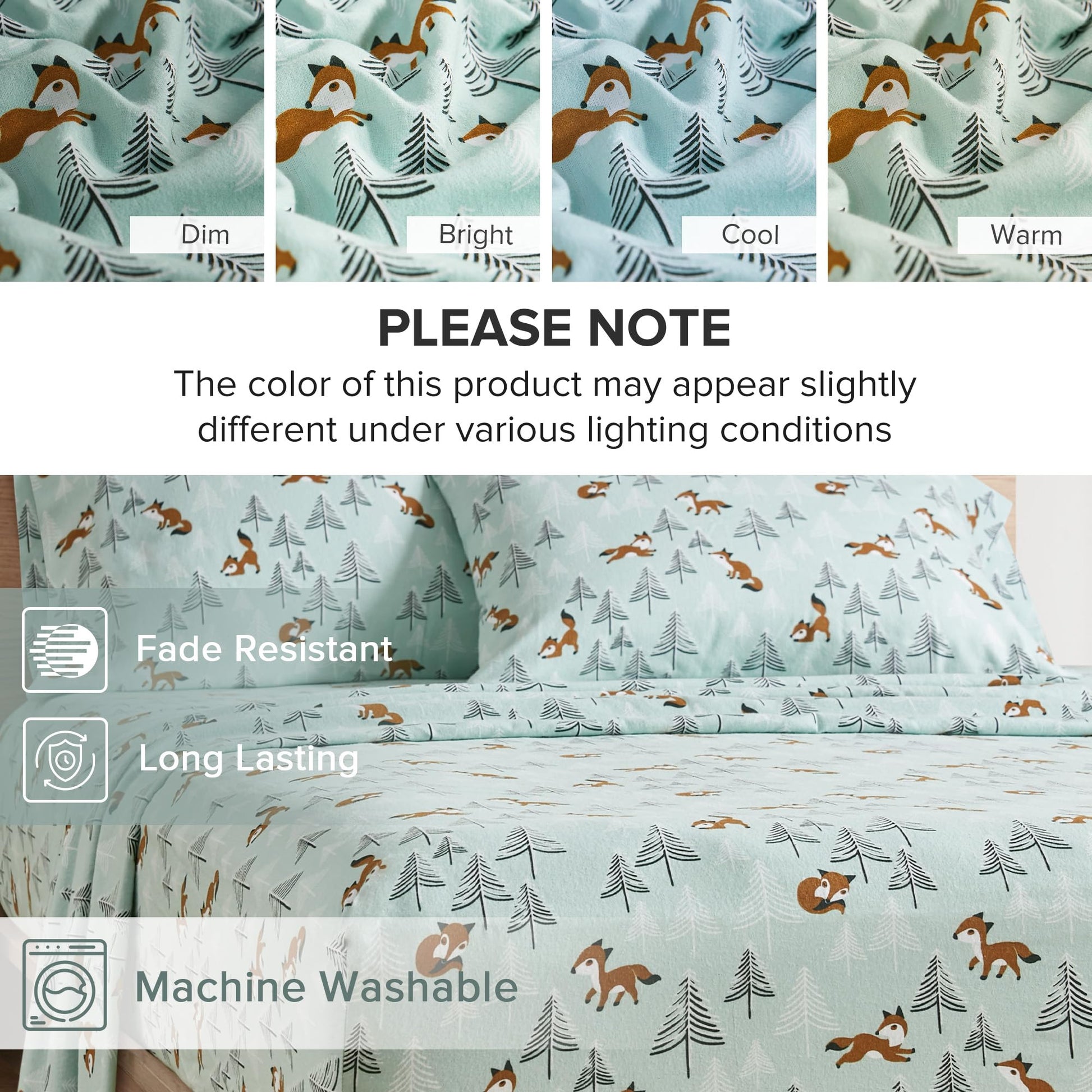 Comfort Spaces Cotton Flannel Breathable Warm Deep Pocket Sheets with Pillow Case Bedding, Twin, Seafoam Foxes 3 Piece
