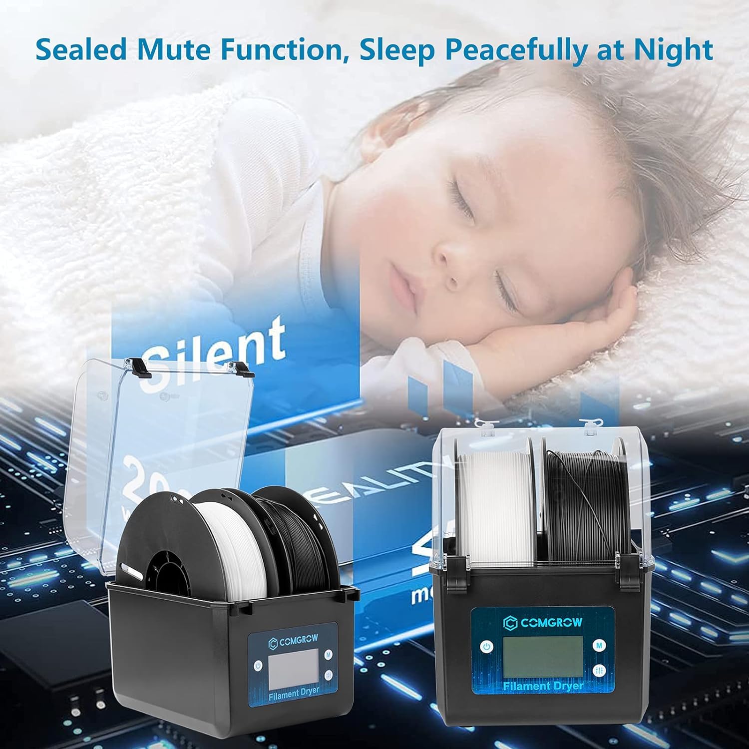 - Filament Dryer and Remove Moisture - Comgrow 3d printer filament dryer box is designed to keep filament dry and remove moisture from kinds of filaments. Internal heating during printing provides a dry storage environment for 3D printer filaments and keeps the filament dry. Avoid entanglement, clogging, poor adhesion, and layer migration caused by the dampness of the printing wire. (Note: Only used for the drying of 3D printer Filament)