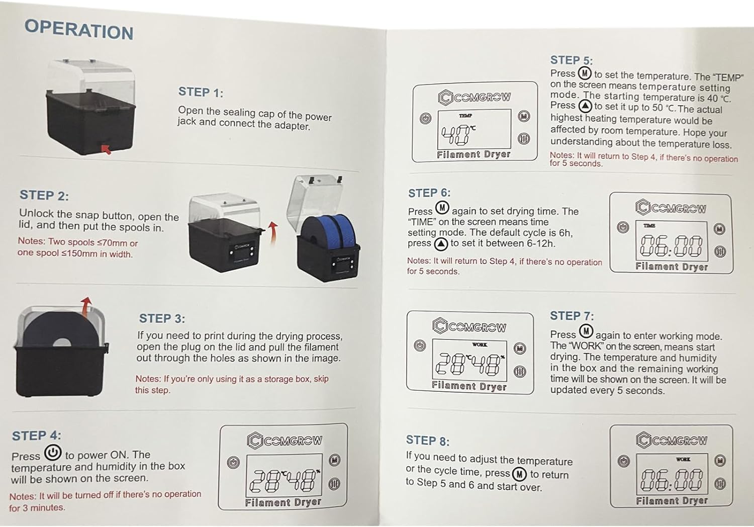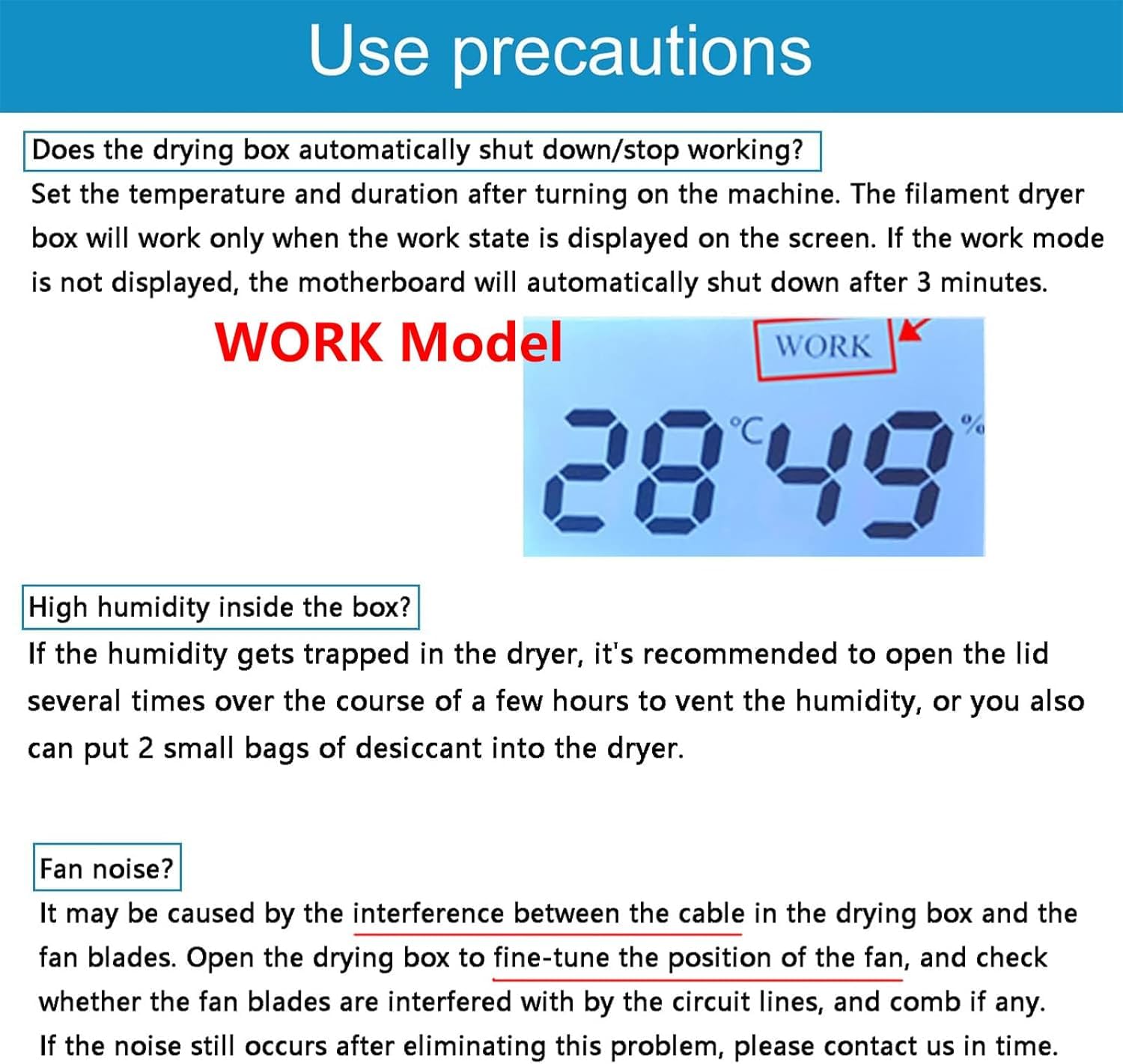 - Setting Notes - Set the temperature and duration after turning on the filament dehydrator. The machine will work only when the work state is displayed on the screen. If the work mode is not displayed, the motherboard will automatically shut down after 3 minutes. If you have any unsolvable problems with the COMGROW filament dryer box, please feel free to contact us, our after-sales technical team will provide you with detailed solutions within 24 hours.