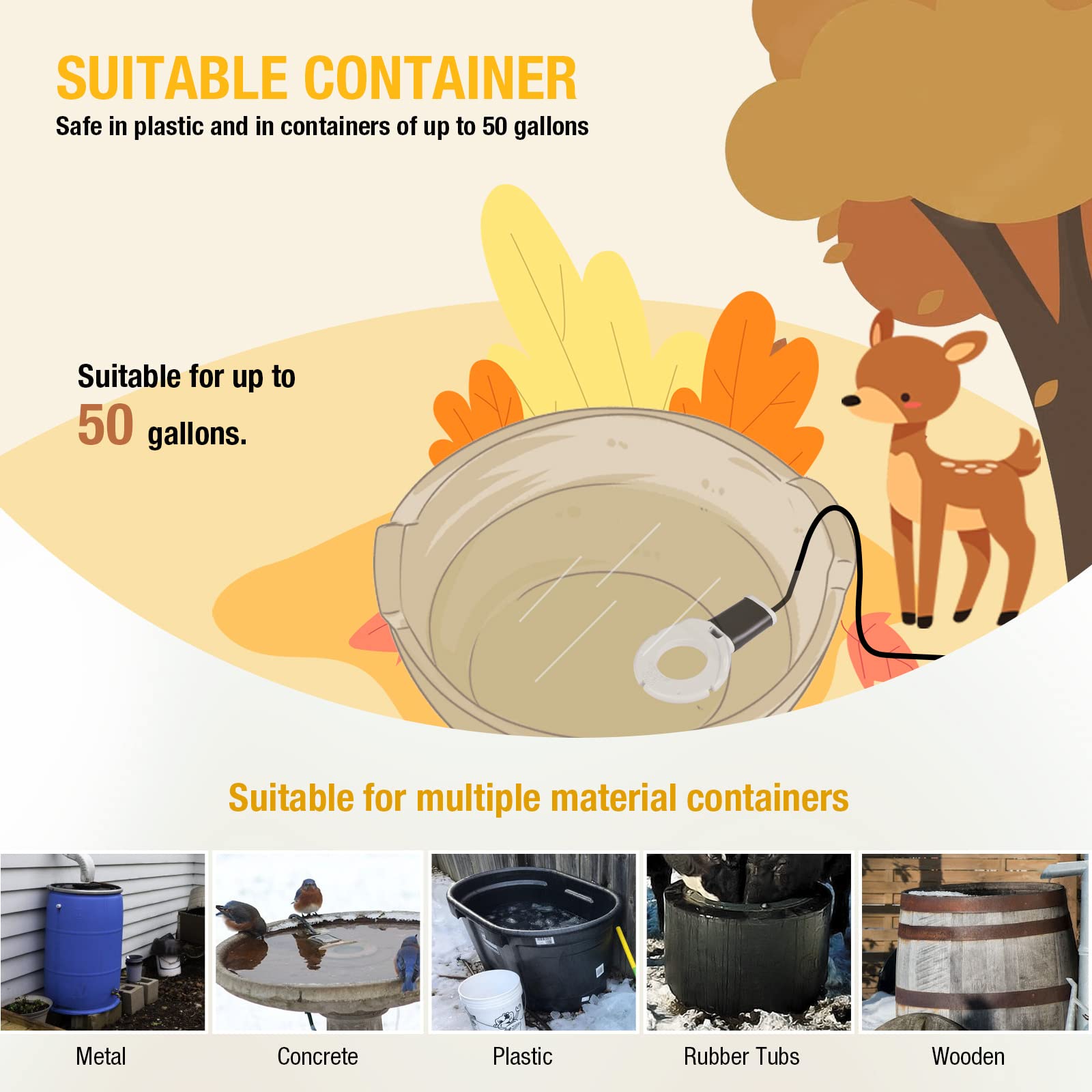 - Versatile for Multiple Uses – Ideal for a variety of farm and home applications, this stock tank heater supports containers from 5 to 50 gallons. Perfect as a bird bath heater, livestock bucket heater, or small animal waterer, it ensures a steady supply of fresh drinking water in winter.