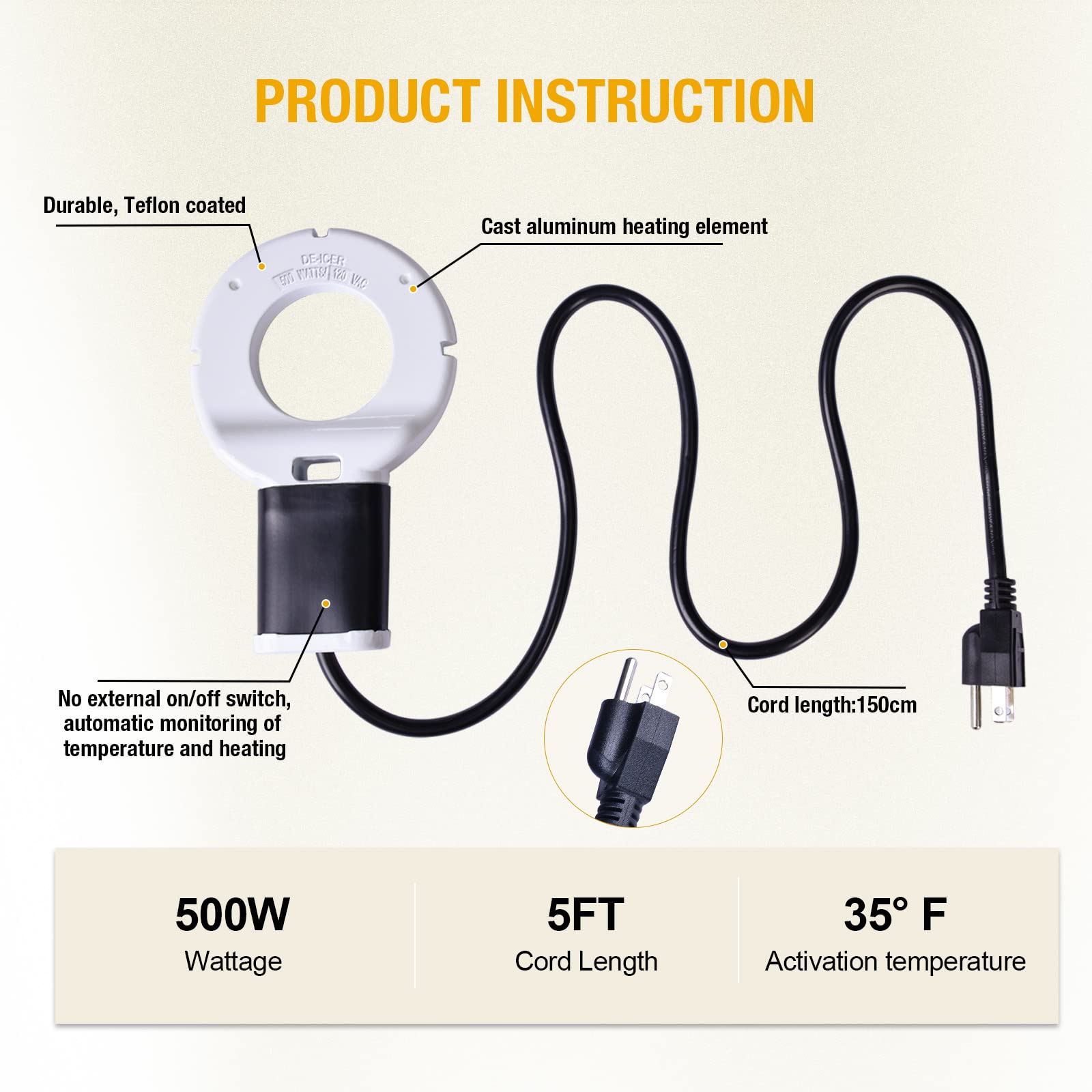 - Safe and Reliable – Features a bite-resistant power cord to offer added safety and durability. Designed for standard 110–120V household power. For safety, always keep the de-icer fully submerged during use and avoid direct contact while heating.
